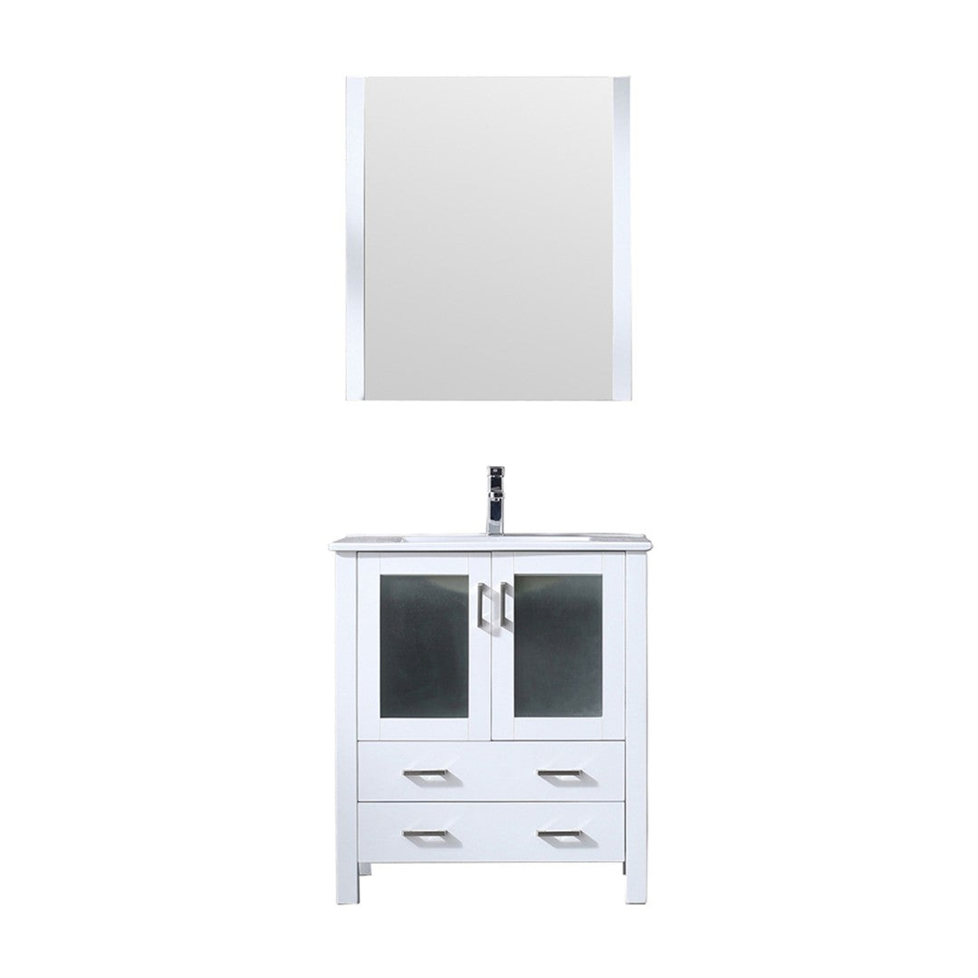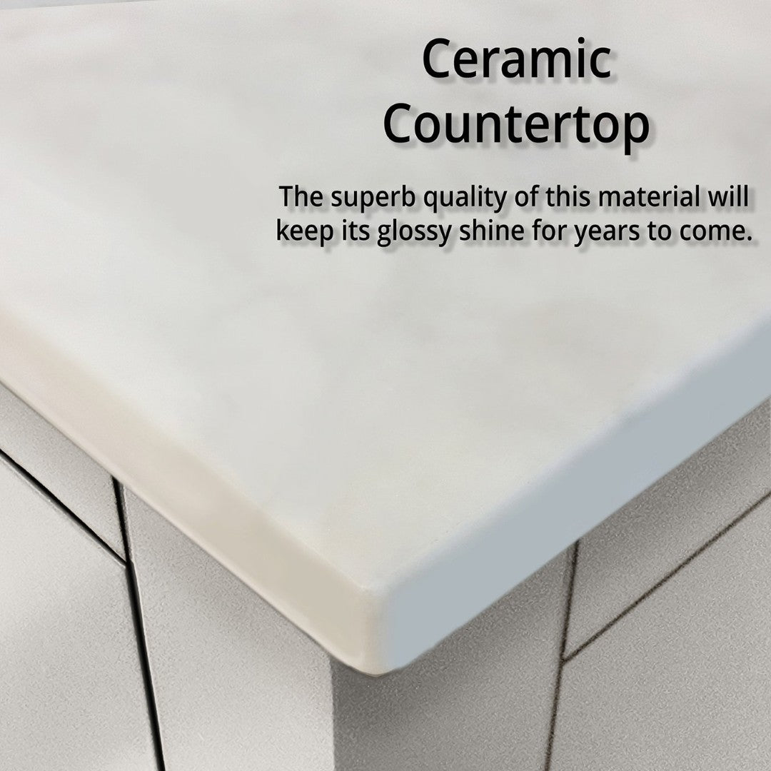 Upgrade your bathroom with this complete white vanity ensemble that combines classic styling with practical durability. Ideal for small to medium bathrooms, it includes a ceramic top, a chrome faucet, and a matching mirror—everything you need for a refreshed, cohesive look.