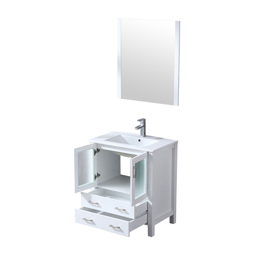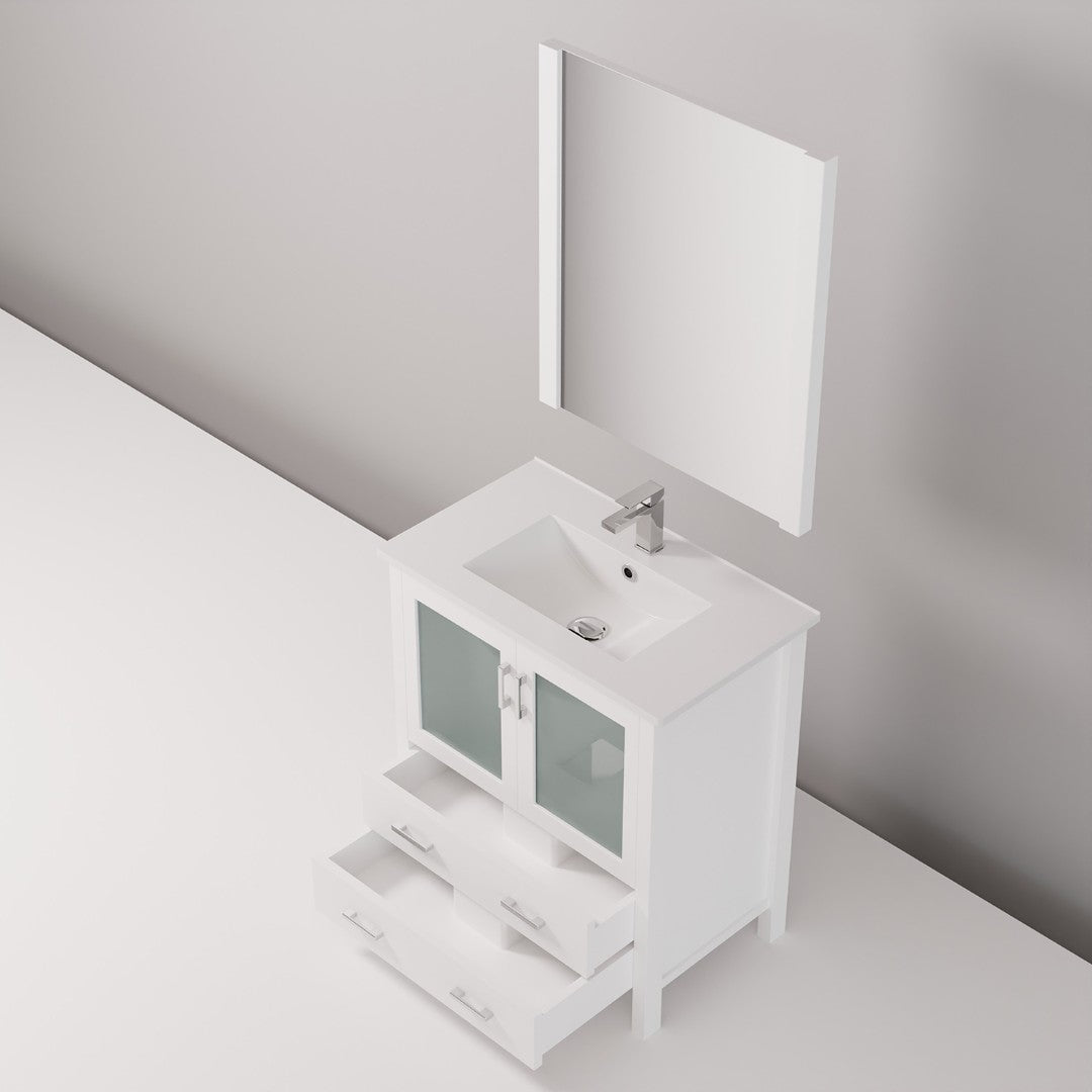 - Included in Package: Vanity cabinet, white ceramic top, Monte chrome faucet, and 28" x 32" mirror — ready for installation