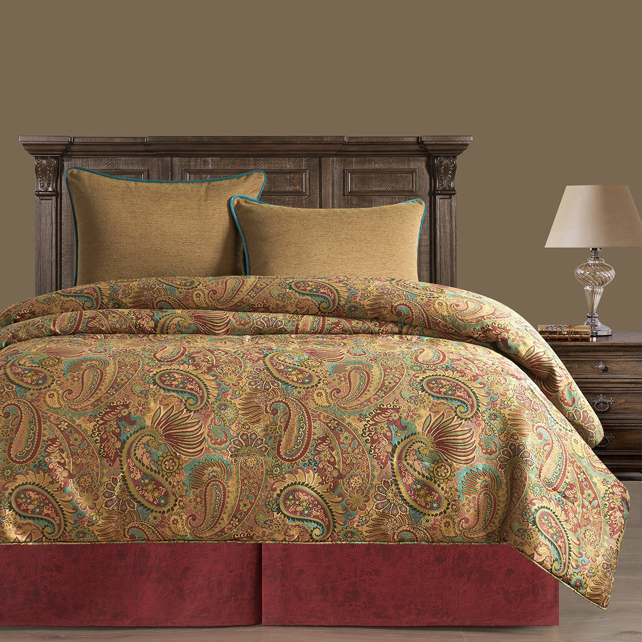 Step into the lush patterns and textures of San Angelo, where vivid jewel tones are flaunted in intricate Western paisley. Embodying playful elegance, San Angelo brings together a rich ensemble of turquoise faux suede, red faux leather, metal conchos, and studs. San Angelo is available with a red, teal, or leopard print bed skirt to best suit your style. For an additional hit of drama, layer on coordinating leopard-print chenille accessories_x0014_including pillows, euro shams, throws, and curtains.