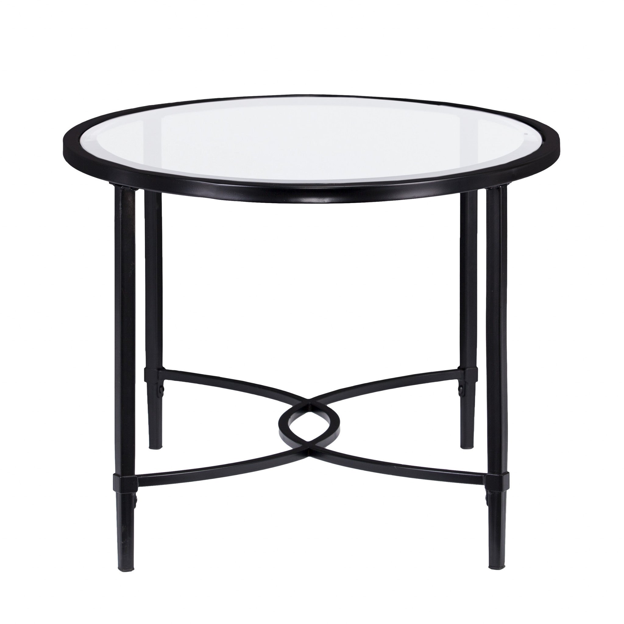 - Sleek glass top with black metal base.