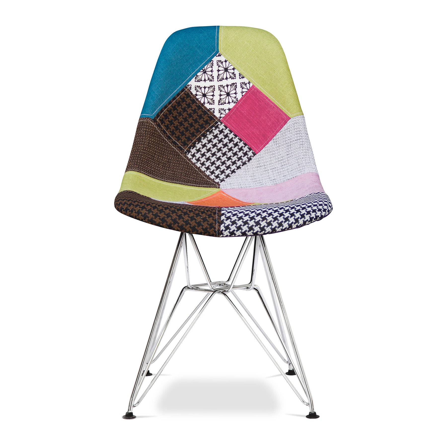 - Heavy duty decorated plastic contoured seat dining chair with geometric chrome base legs.