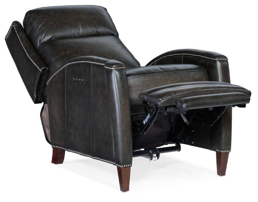 Sink into luxurious relaxation with the Declan Power Recliner, a refined blend of traditional styling and modern convenience. Crafted in hand-wiped Brindisi Trinita leather and detailed with antique/gold-accent nailhead trim and a modified wing back, this power recliner delivers supportive comfort with a power headrest and smooth power recline. Thoughtfully finished with dark wood legs and a built-in USB port, it’s designed to complement formal living rooms, studies, or home theaters while keeping your devices charged and within reach.