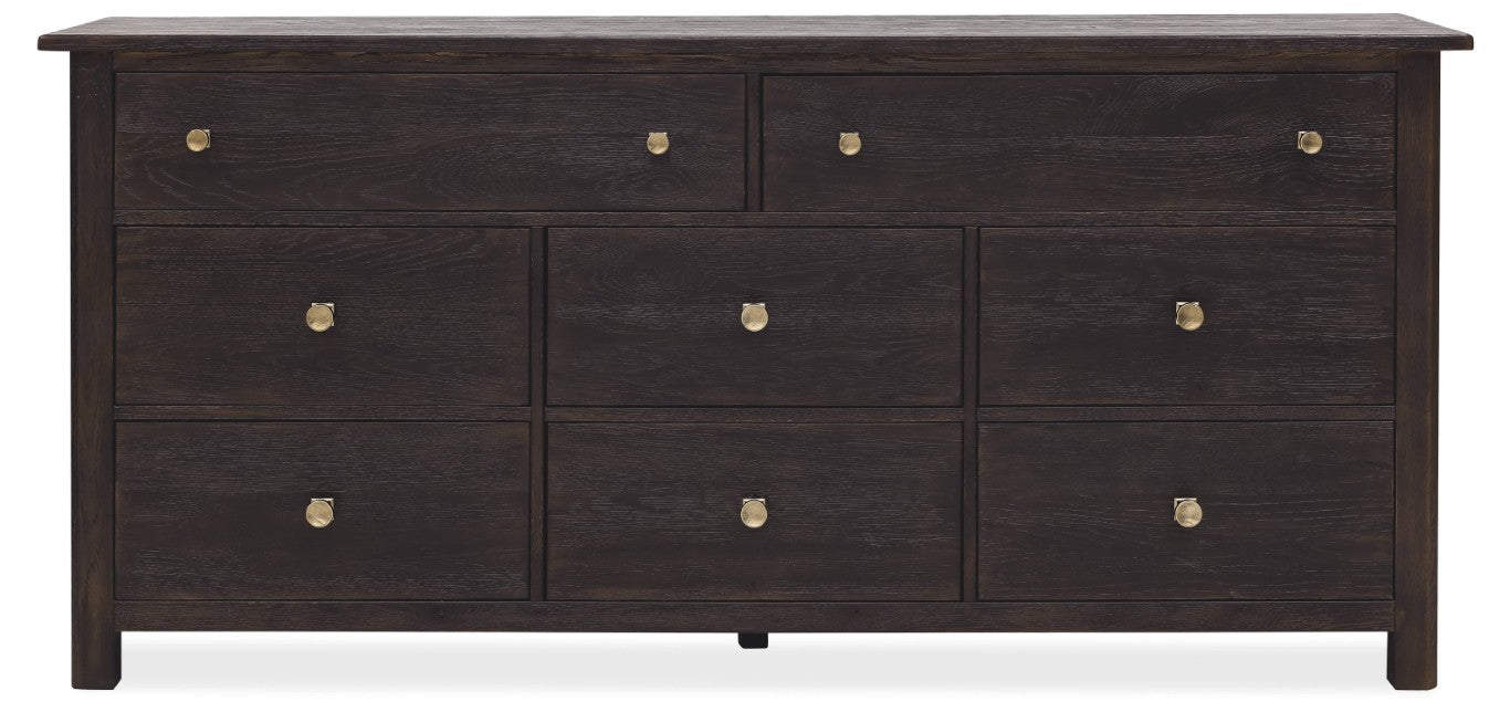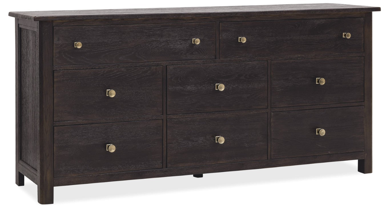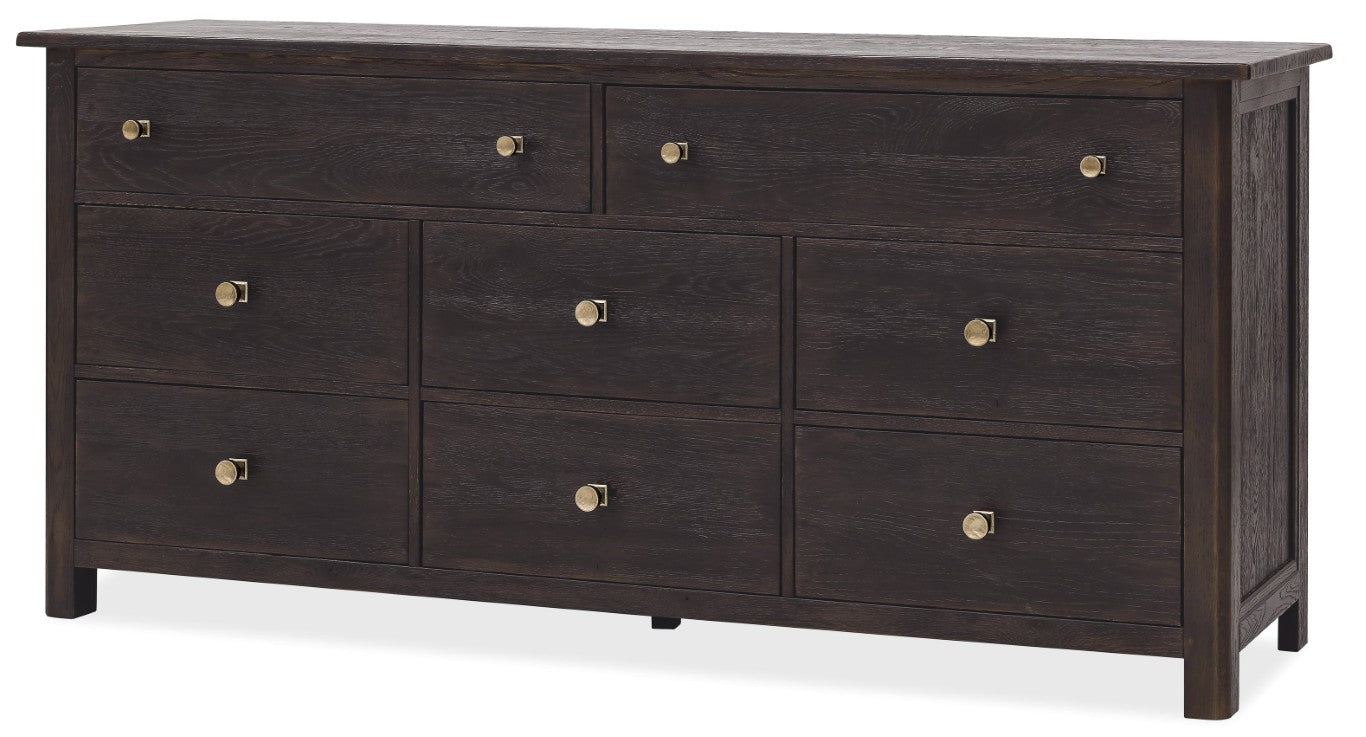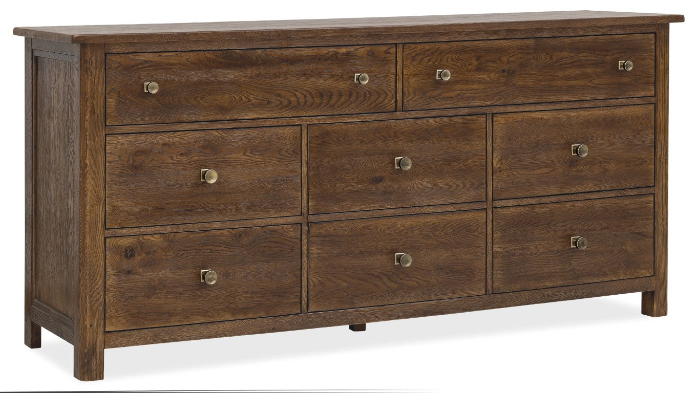 Bring rustic charm and practical organization to your bedroom with this Driftwood eight-drawer dresser. Crafted with a Buckboard finish that evokes the warm, sun-faded look of oak and distressed character details, this piece blends vintage appeal with modern convenience—ideal for keeping larger wardrobes neat while adding textured, lived-in style to your space.