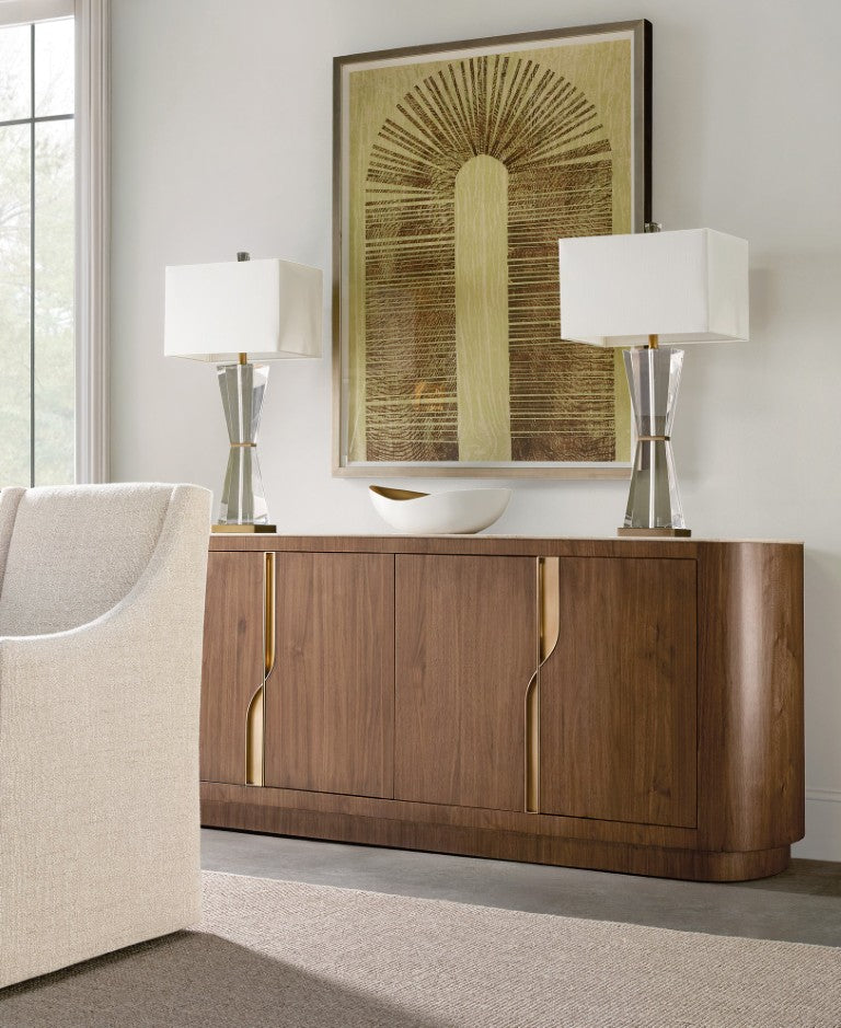 Elevate your dining room or living space with the Eleana Credenza — a refined balance of elegant materials and thoughtful storage. Warm Light Caramel walnut veneers pair with a honed white-and-beige marble top and Sunlit Bronze hardware to create a versatile, transitional piece that feels both luxurious and approachable. Rounded sides and a low plinth base give the credenza a sculptural silhouette, while soft-close doors, self-closing drawers, and adjustable shelving keep daily use effortless and organized.