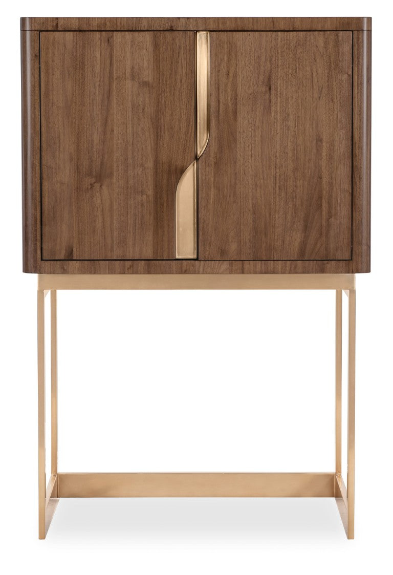 Elevate your entertaining with the Eleana Bar on Stand — a refined bar cabinet that combines warm Light Caramel walnut veneers with elegant Sunlit Bronze metal accents. Designed for modern transitional interiors, it conceals a well-organized, illuminated service area behind two wood doors, offering polished storage and presentation for spirits, glassware, and bar tools.