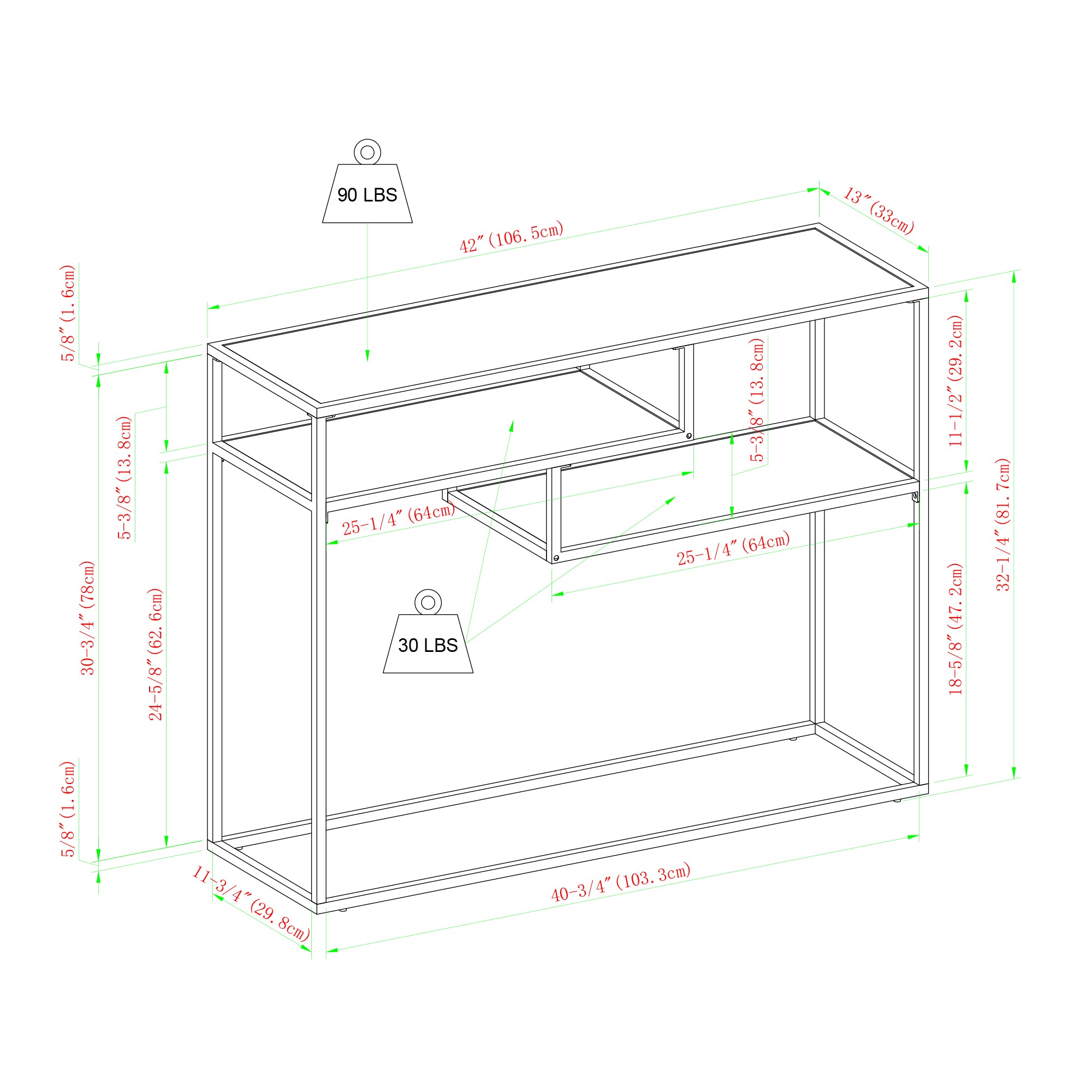 - Dimensions: MAYL2KSB 42" Metal and Wood Tiered Shelf Entry Table - 32.25" H x 42" L x 13" W
