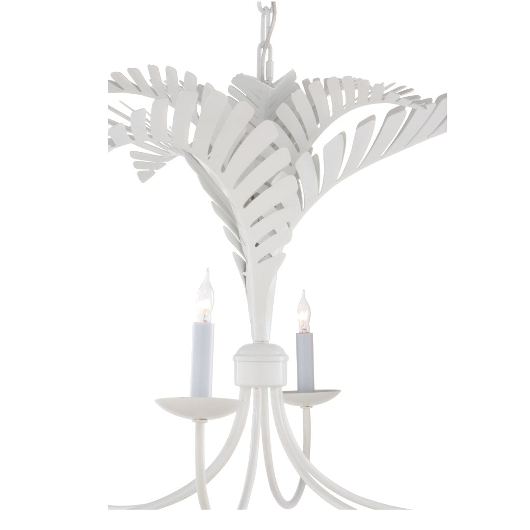 Bring a touch of Palm Beach elegance to your home with this slender, six-arm tole chandelier designed by Meg Braff for Wildwood. The Royal Palm Chandelier features delicate palm-frond detailing and a clean white finish that complements coastal, tropical, and transitional interiors while offering graceful ambient lighting for dining rooms, entryways, or living spaces.