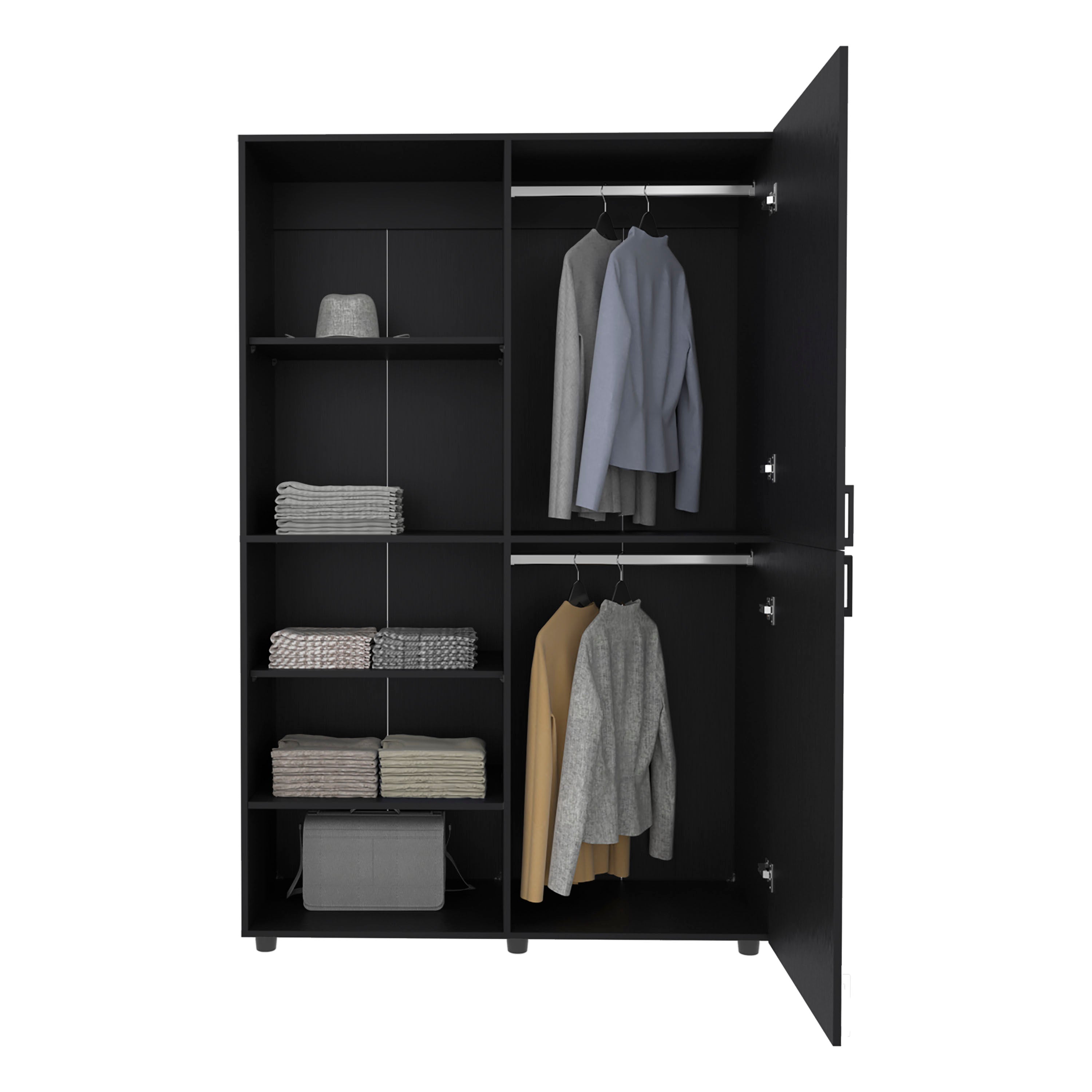 Organize your space with this sleek, space-saving freestanding armoire designed for compact bedrooms, entryways, or closets. The tall two-door cabinet combines hanging and shelf storage in a modern black wenge finish, delivering stylish functionality for small footprints while keeping clothes and accessories neatly stowed.