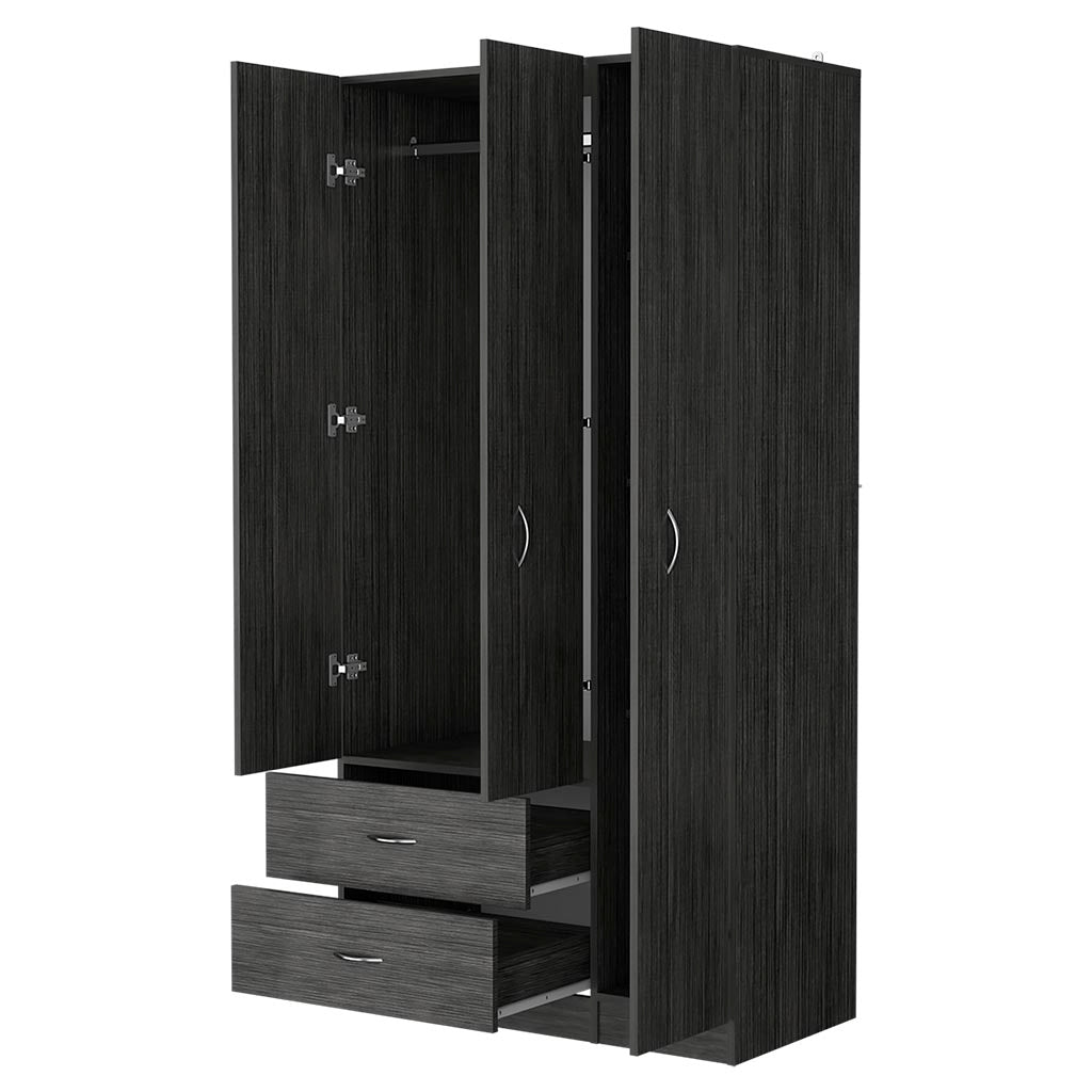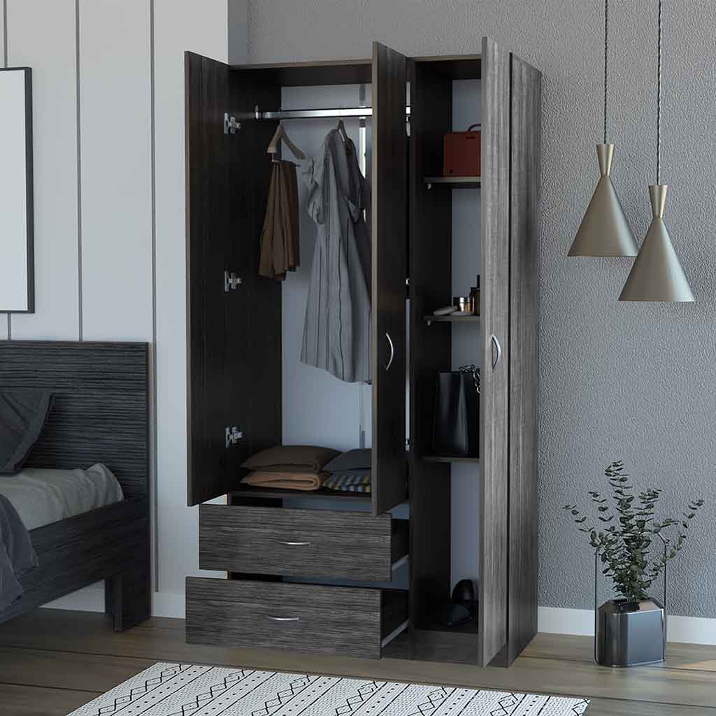 Bring order and style to your bedroom with this versatile Smoke Oak armoire designed for efficient clothing storage and a clean, contemporary look. With multiple shelving options, two roomy drawers, and a double-door clothing cabinet with rod, it’s an ideal solution for extra wardrobe space in rooms without built-in closets.