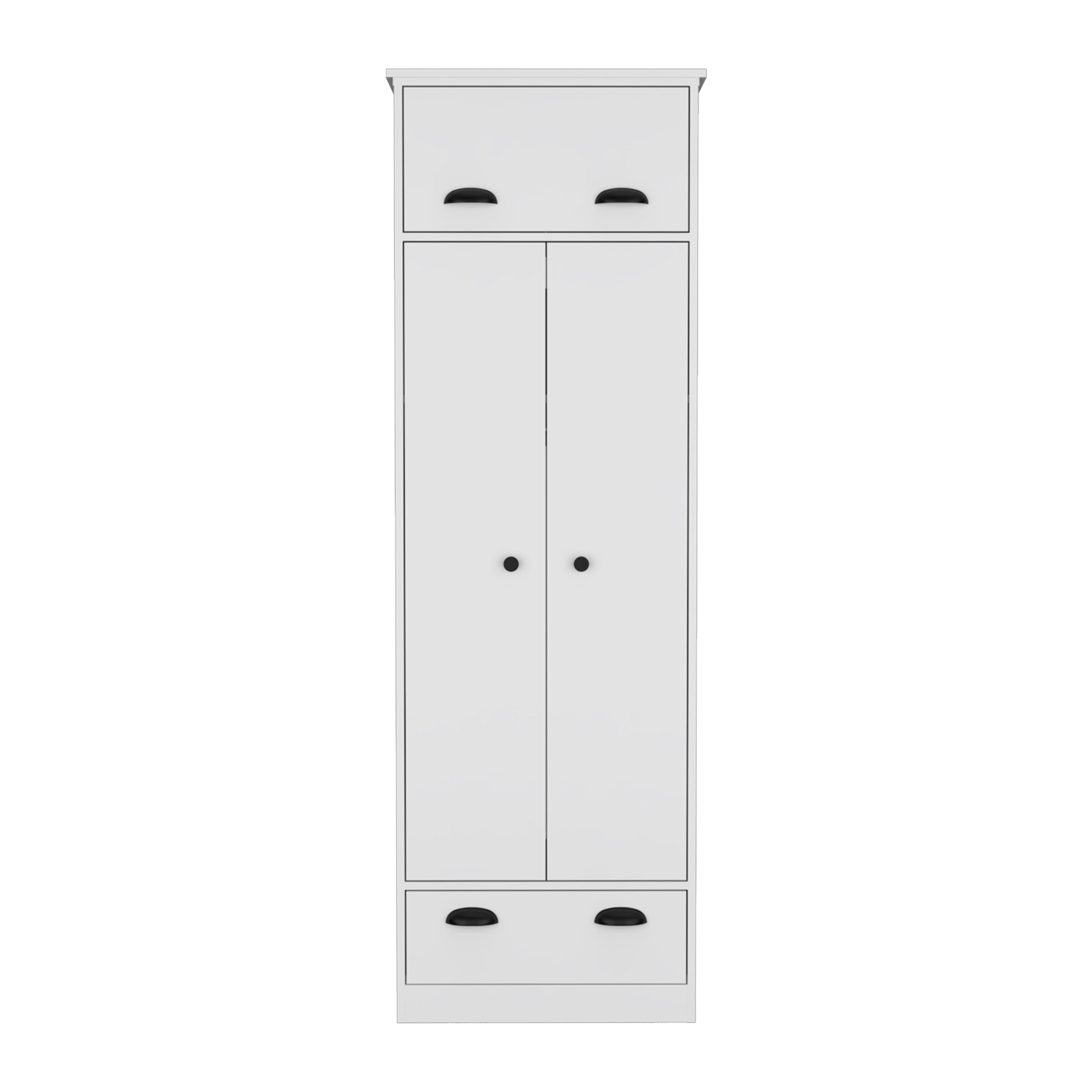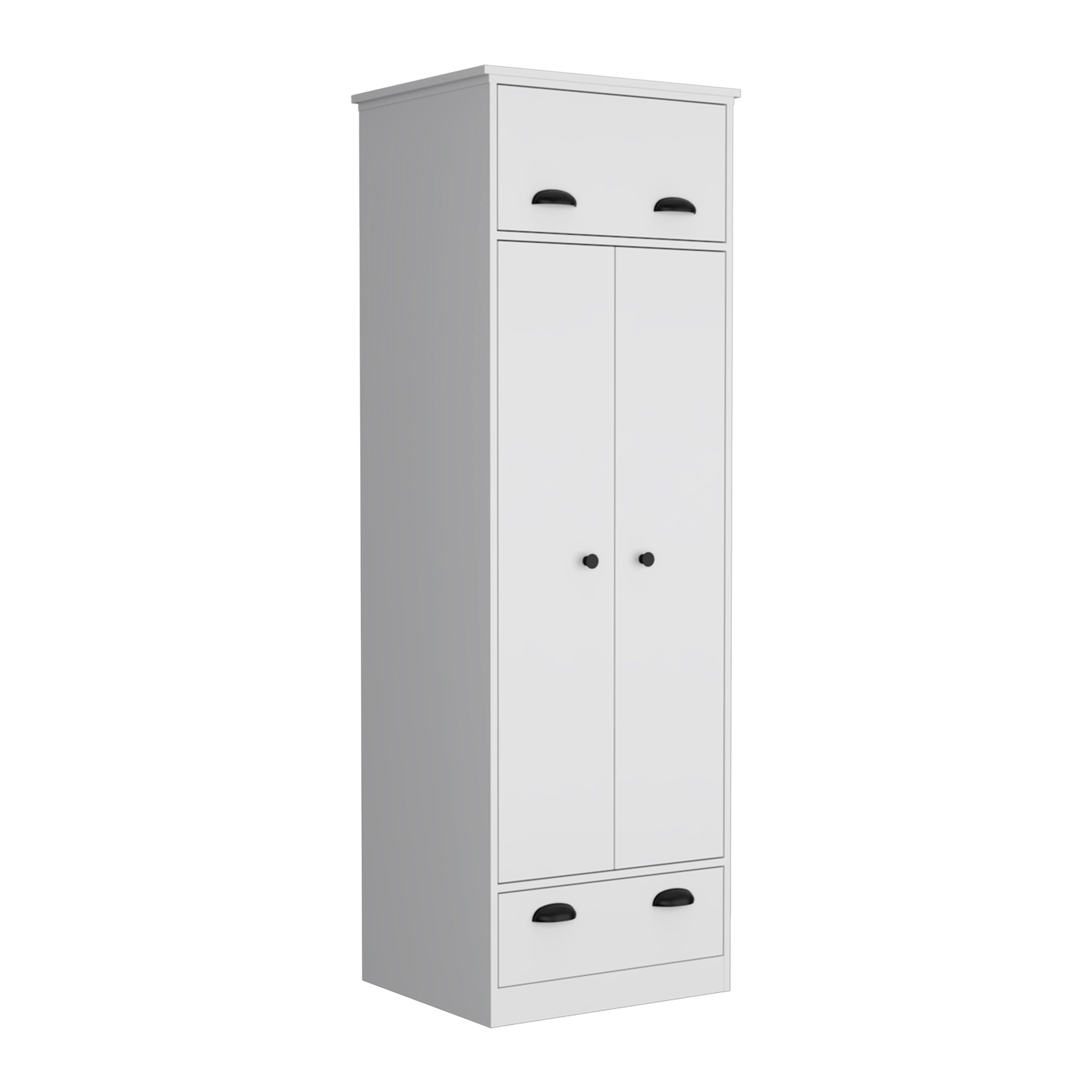 Bring order and style to your bedroom with the Falkland Armoire — a clean-lined white storage piece designed to maximize wardrobe capacity while keeping everyday items within easy reach. Its combination of a spacious hanging area, an accessible hinged compartment, and a lower pull-out drawer makes it a versatile solution for clothing, accessories, and linens in homes where both function and appearance matter.