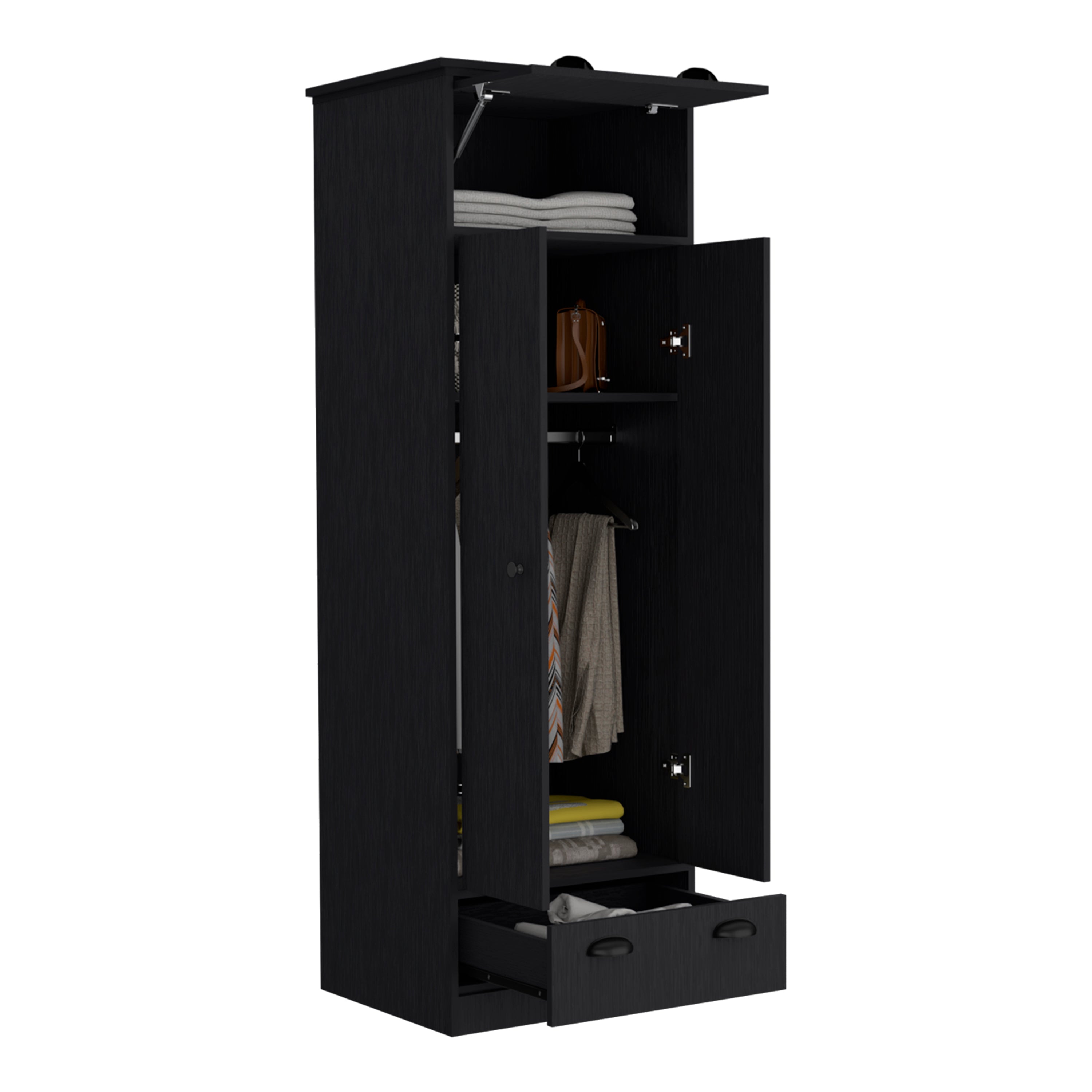 - Spacious double-door cabinet: Large internal compartment with a sturdy hanging rod for shirts, jackets, dresses, and longer garments to stay wrinkle-free and organized.