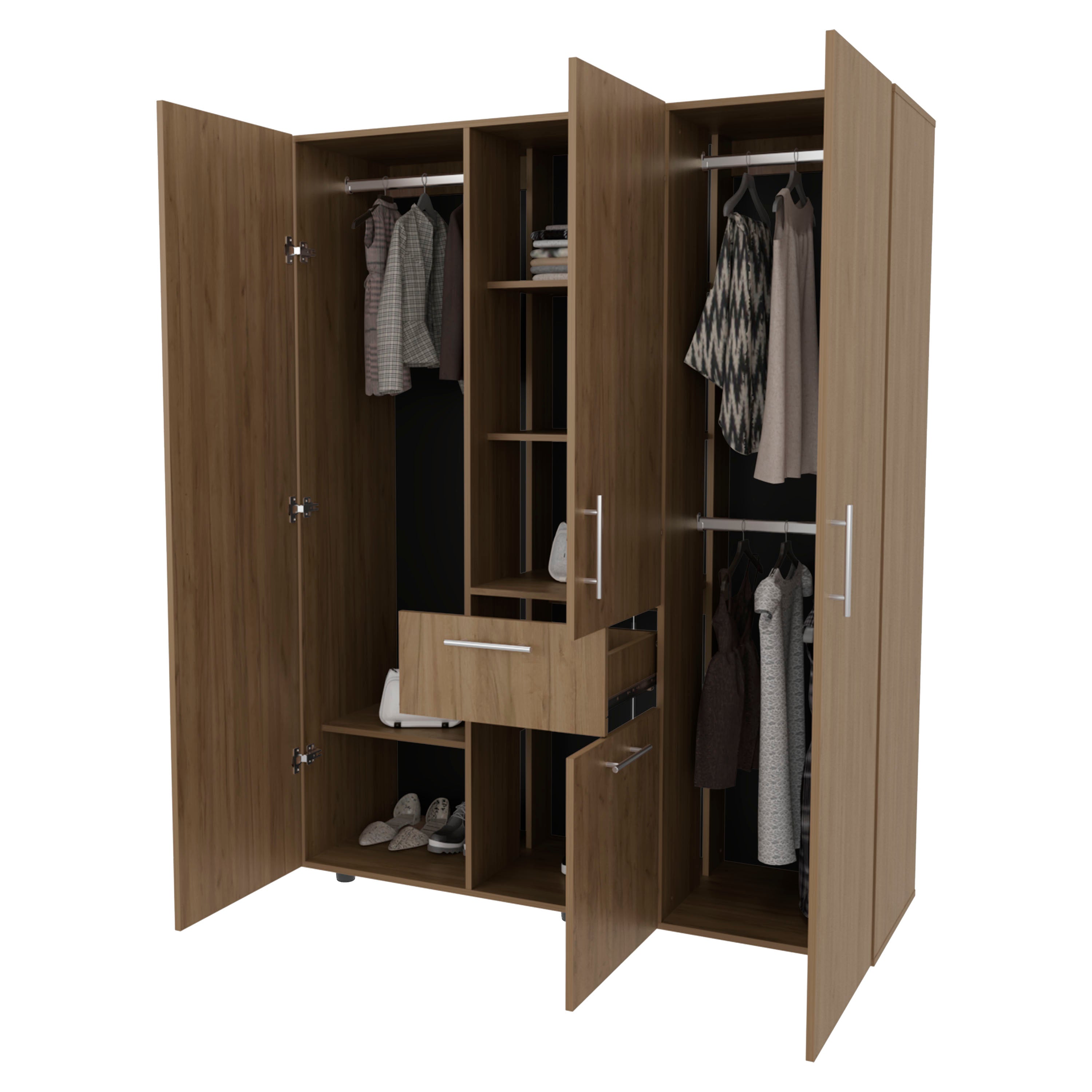 - Storage layout: Four-door configuration with two full-height hanging sections on metal rods for wrinkle-free garments, central shelving for folded items and handbags, and a large bottom drawer for additional storage.