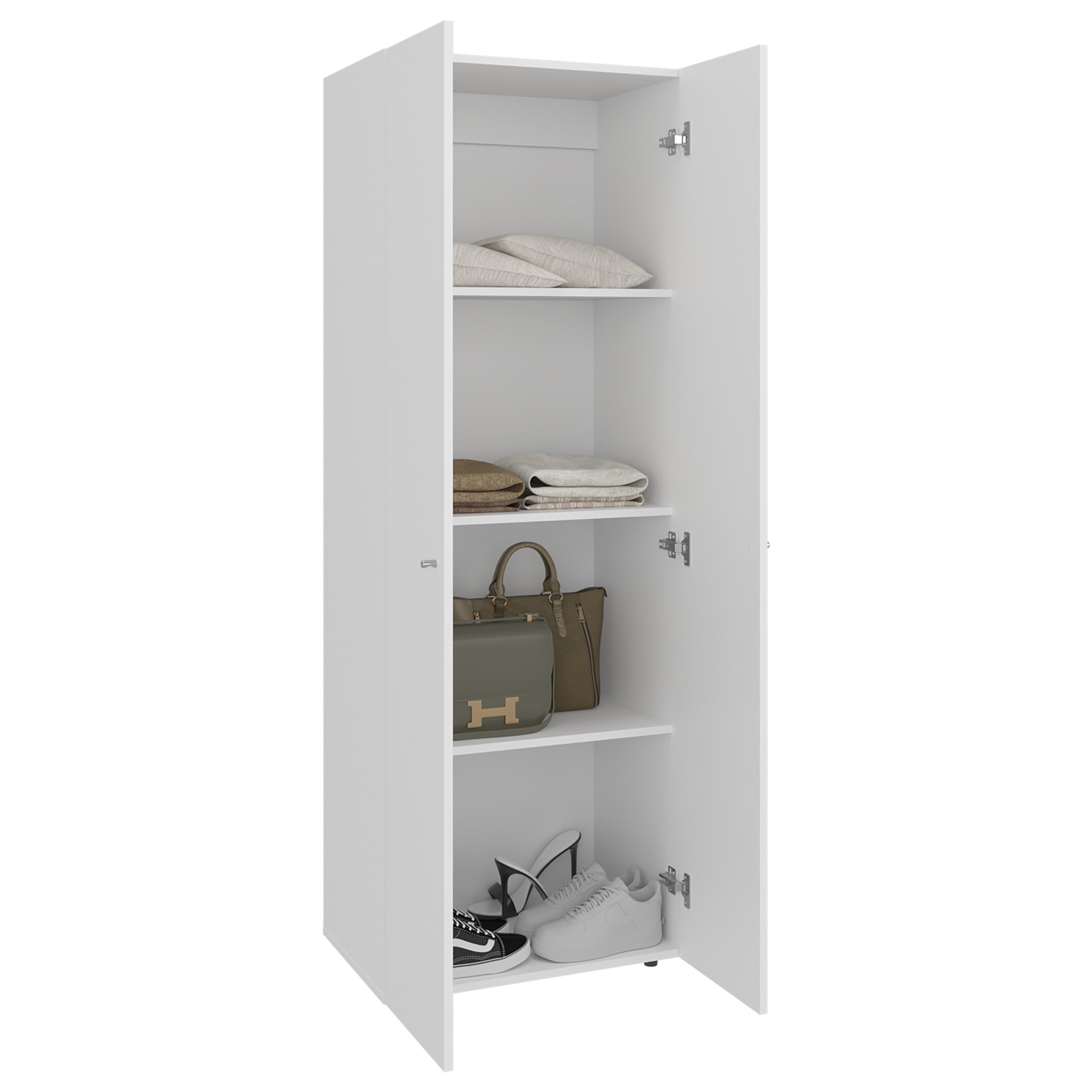 - Four fixed shelves: Multiple fixed interior shelves provide consistent, organized space for folded clothing, towels, linens, and shoes.