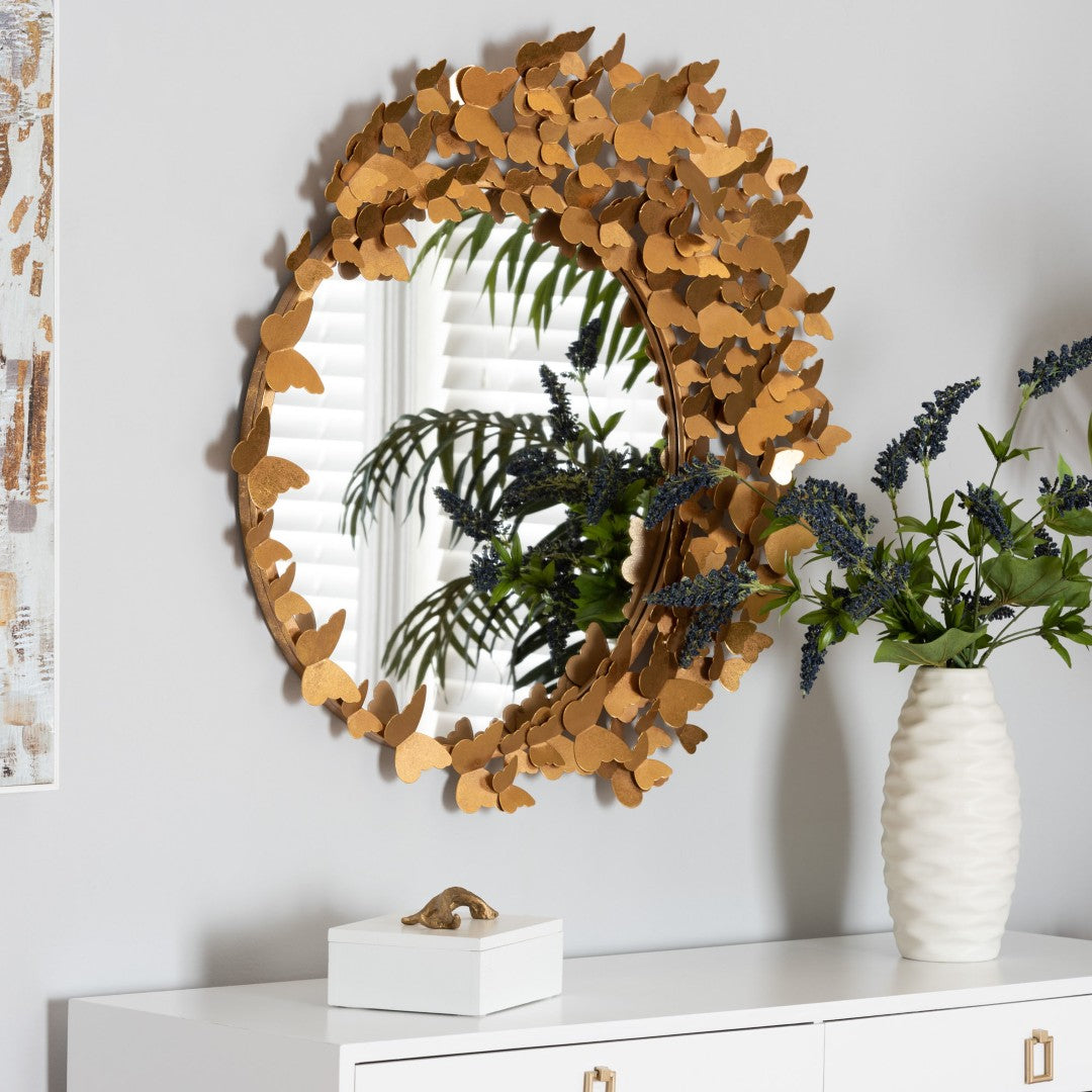 Introduce a touch of whimsical glamour to your room with this luxe antique goldleaf metal butterfly accent mirror. Its round central mirror and sculptural metal butterflies create a dynamic focal point that catches light and adds depth to living rooms, bedrooms, entryways, or dressing areas. Fully assembled and ready to hang, this piece blends decorative artistry with functional reflective surface for an immediate style upgrade.