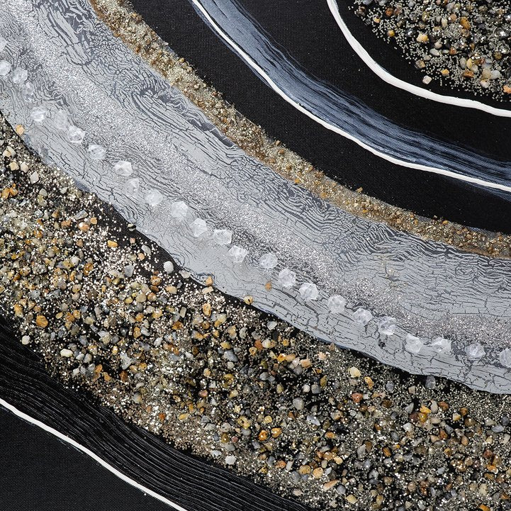 This elongated landscape oil painting blends contemporary metallic accents with tactile stone and crystal embellishments to create a dynamic focal point for living rooms, offices, or entryways. The layered blacks, whites, and metallic silvers and golds evoke a celestial or galaxy-inspired scene, while the smooth silver frame and added stones introduce depth and refined texture for a sophisticated, gallery-quality display.