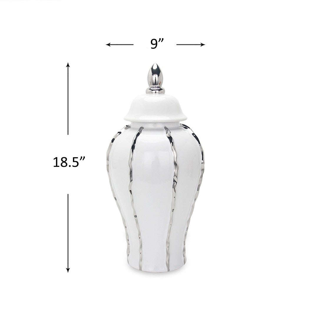 - This exquisite ginger jar boasts a pristine white base, adorned with a stunning silver design that adds a touch of luxury and sophistication to any space. Whether used as a centerpiece, displayed on a shelf, or showcased on your mantel, this jar will instantly elevate the aesthetic of your living room, bedroom, or dining area. It can also be used as a vase for your favorite fresh or artificial flowers, instantly transforming it into an enchanting centerpiece that will dazzle your guests.