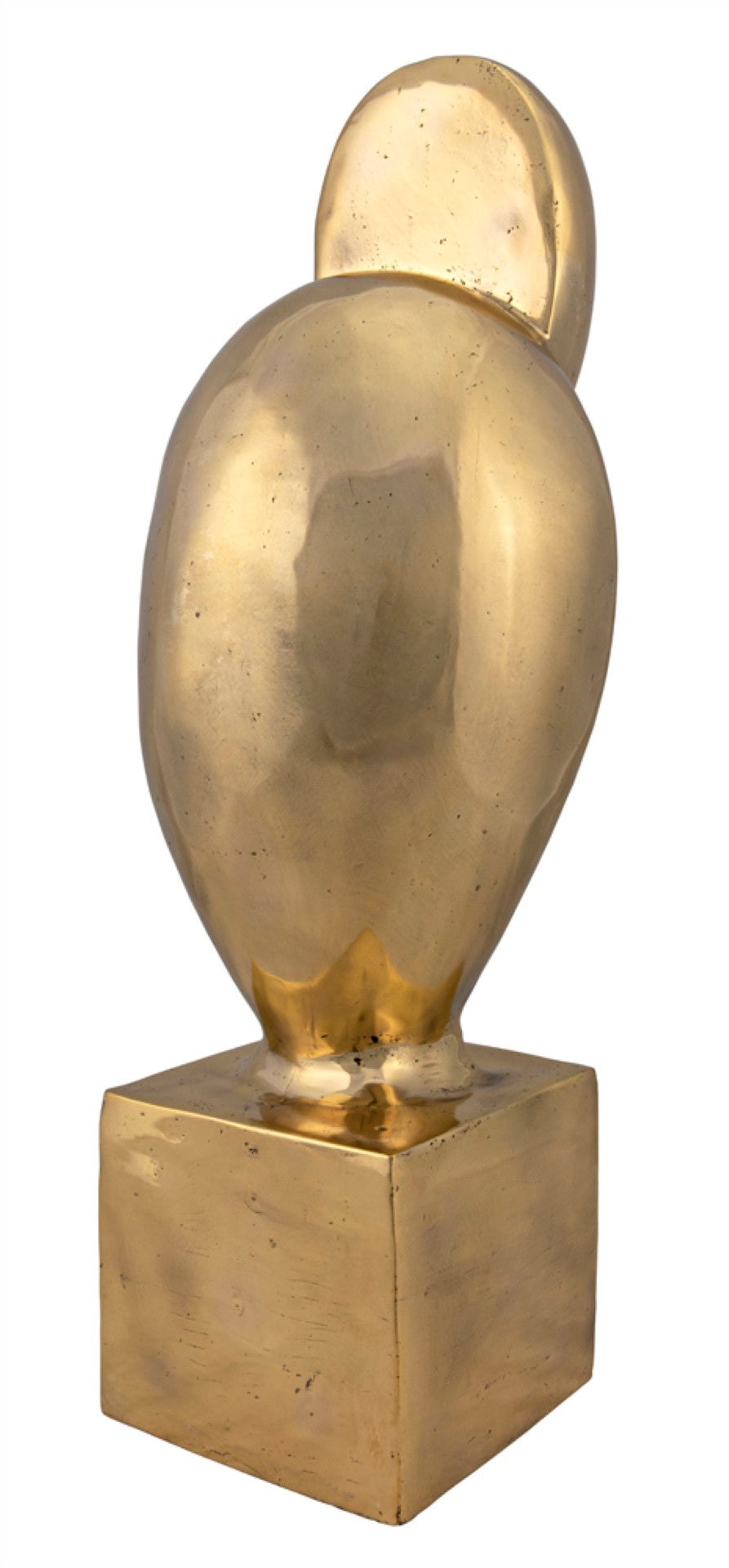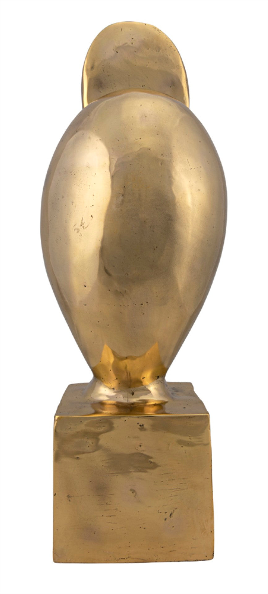 A striking modern-primitive sculpture that channels the grace and power of a bird-of-prey, finished in antique brass over metal. Perched on a cube base and crafted from simple geometric forms, this totem makes a bold yet refined statement — perfect for a mantel, console, or entryway where it can command attention and complement contemporary or eclectic decor.