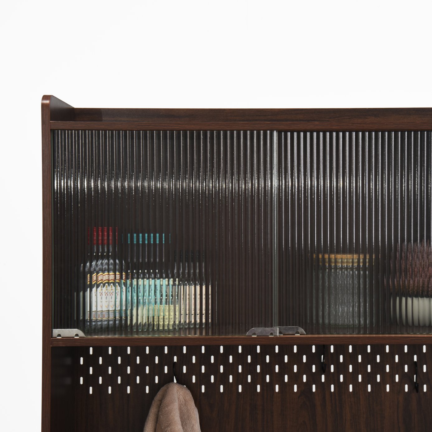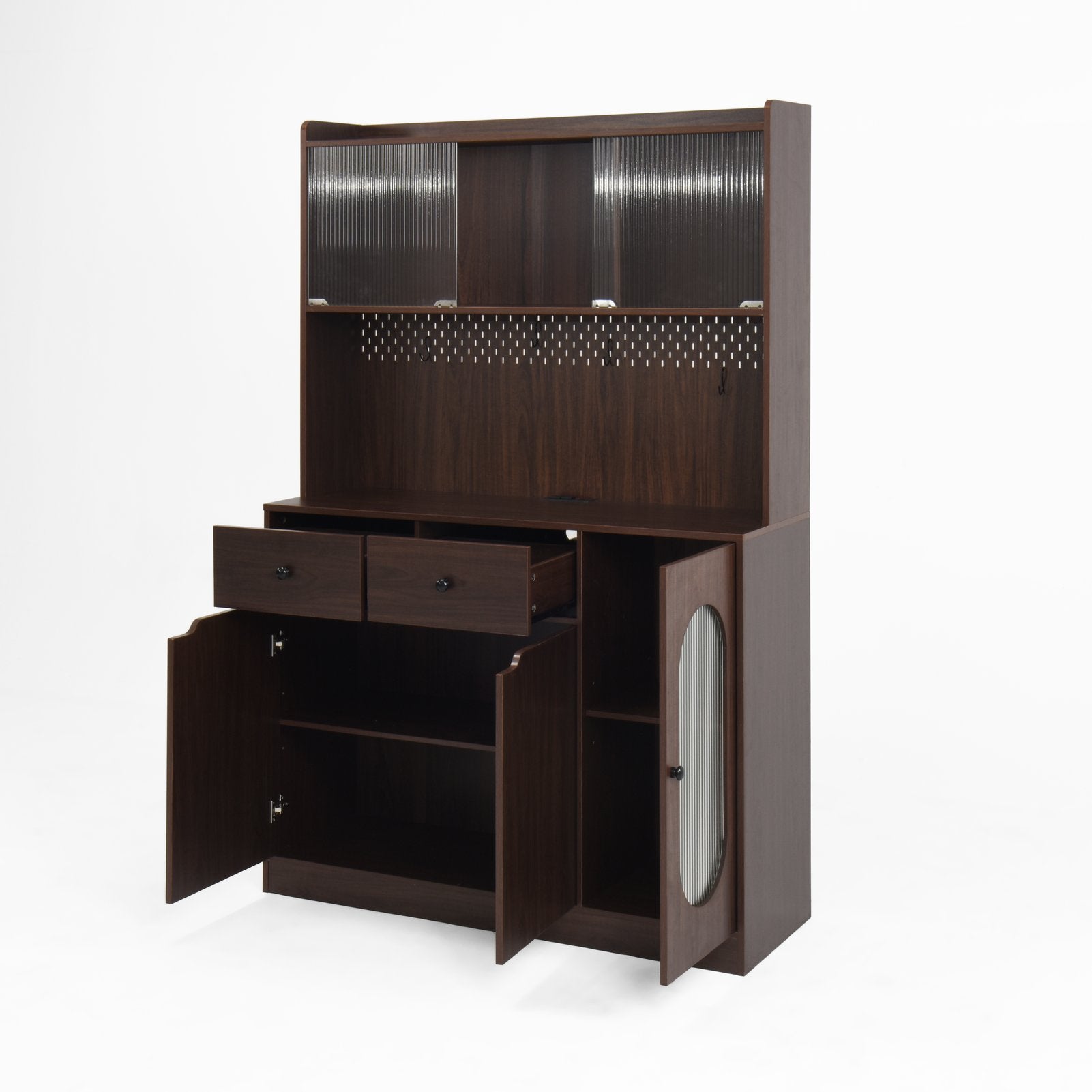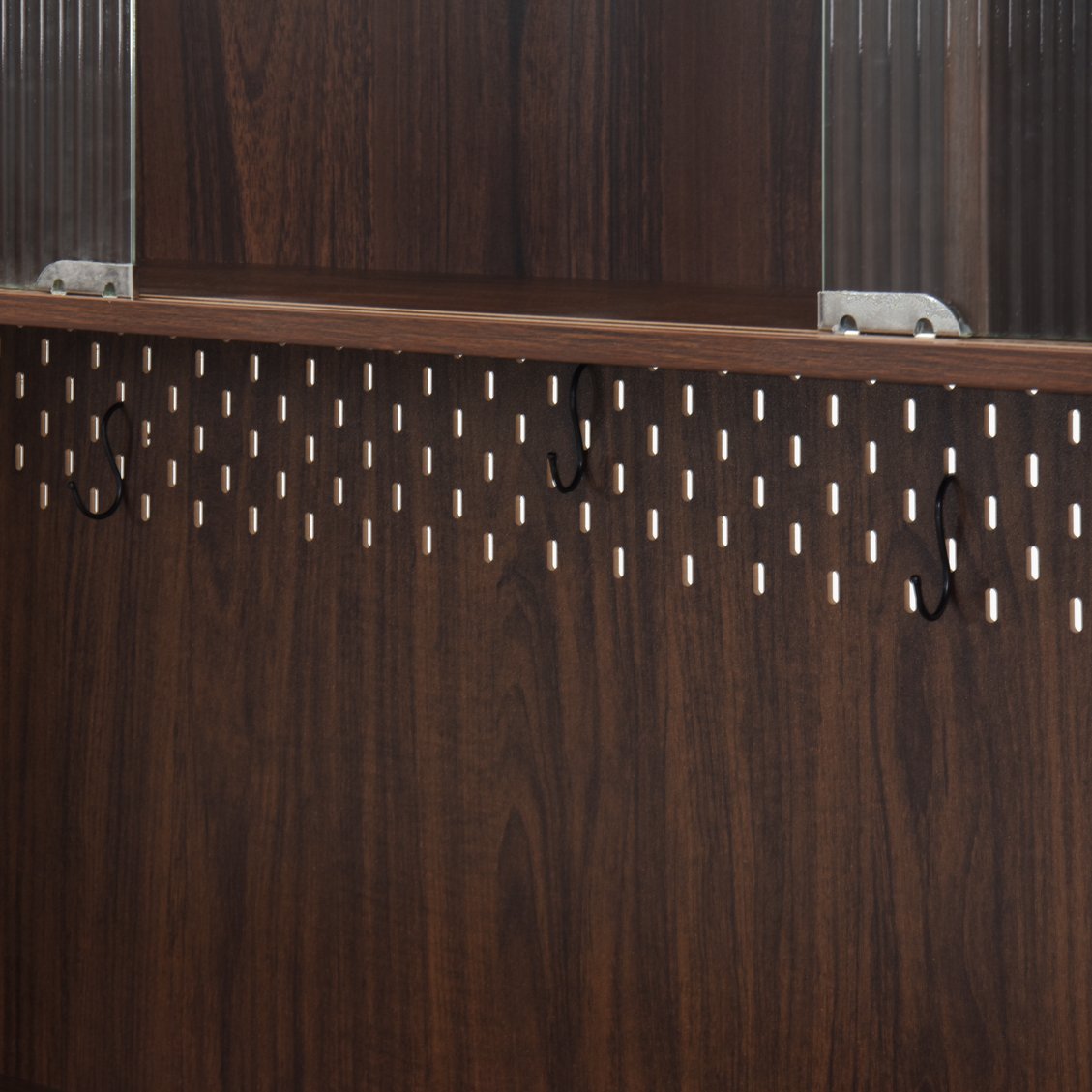 Keep your kitchen, pantry, or living area organized and stylish with this tall, multi-function storage cabinet. Designed for large-capacity storage and convenient appliance placement, it combines reeded glass display doors, a dedicated microwave stand, and thoughtful organizer details like pegboard backing and included hooks — all in a warm walnut finish that complements a variety of décors.