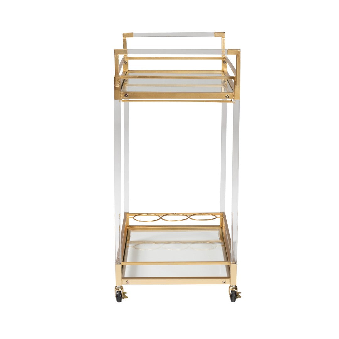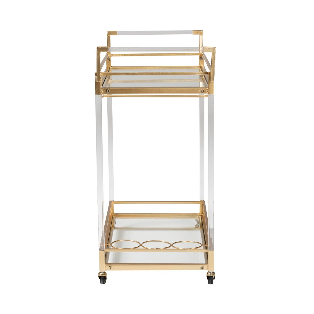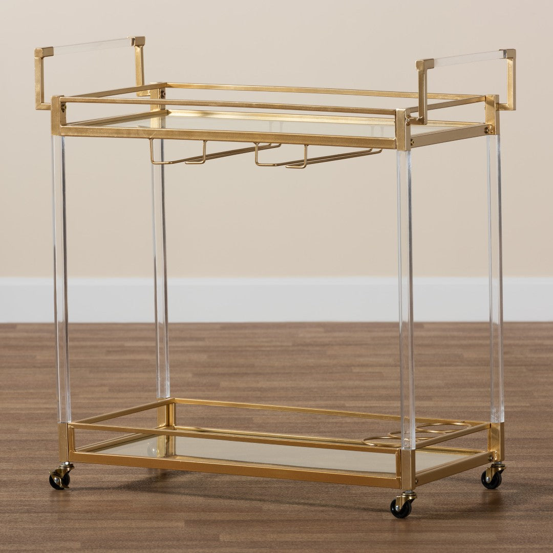 Elevate your entertaining with this contemporary glam wine cart that blends luxe gold metal with clear glass for a chic, showroom-ready display. Thoughtfully designed for both presentation and practicality, it keeps stemware secure, bottles showcased, and service mobile—perfect for intimate gatherings or elegant home bars.