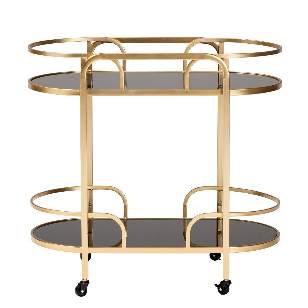 Elevate your entertaining space with the Leighton wine cart — a contemporary glam centerpiece that blends luxe gold metalwork with durable tempered glass. Designed to showcase bottles and serve guests with style, this two-tier cart combines an openwork silhouette, raised guard rails, and smooth caster wheels for a striking yet practical addition to living or dining areas. Assembly is required, and the cart is crafted to balance visual allure with everyday function.