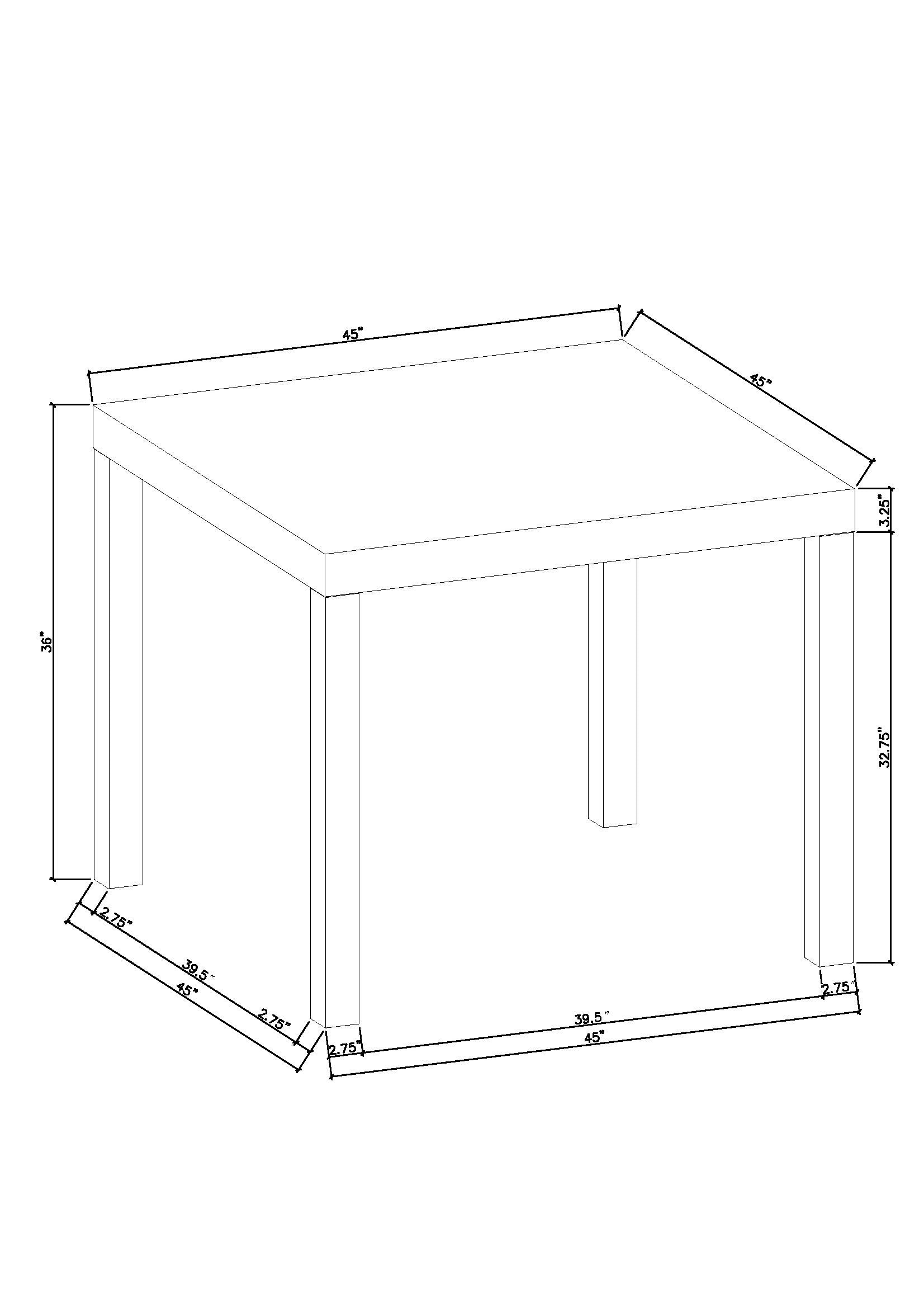 - Dimensions: Table: 45" W x 45" D x 36" H. (Note: listing also shows alternate/unit packing dimension: 48.5" L x 48.5" W x 9" H.)