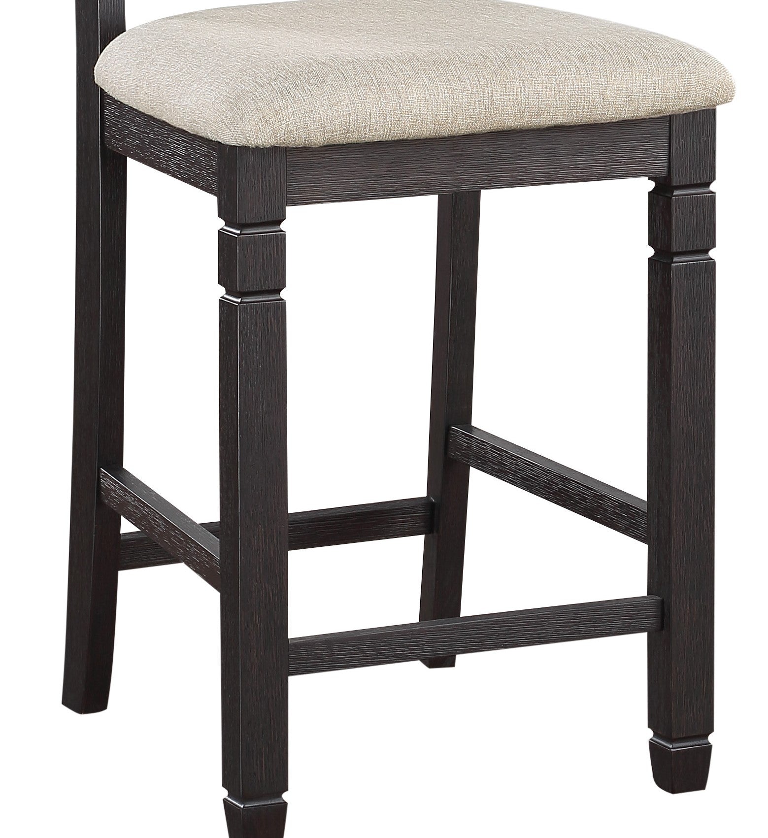 Elevate your casual dining area with this stylish 5-piece counter-height dining set that blends transitional design with practical storage. The warm brown and black finish over acacia veneer highlights natural wood grain while the compact round table and coordinated chairs create an inviting spot for meals, homework, or entertaining. Built-in open shelving keeps essentials within reach, and the cushioned beige fabric seats deliver comfortable everyday seating.