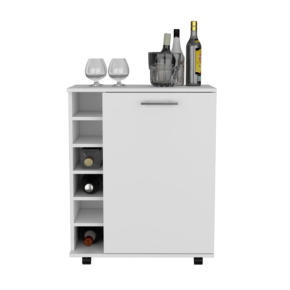 Bring effortless style and function to your living room with this sleek white bar cart. Designed for entertaining and everyday convenience, it combines smart storage, a generous serving surface, and smooth mobility in a compact engineered-wood design that complements modern interiors.