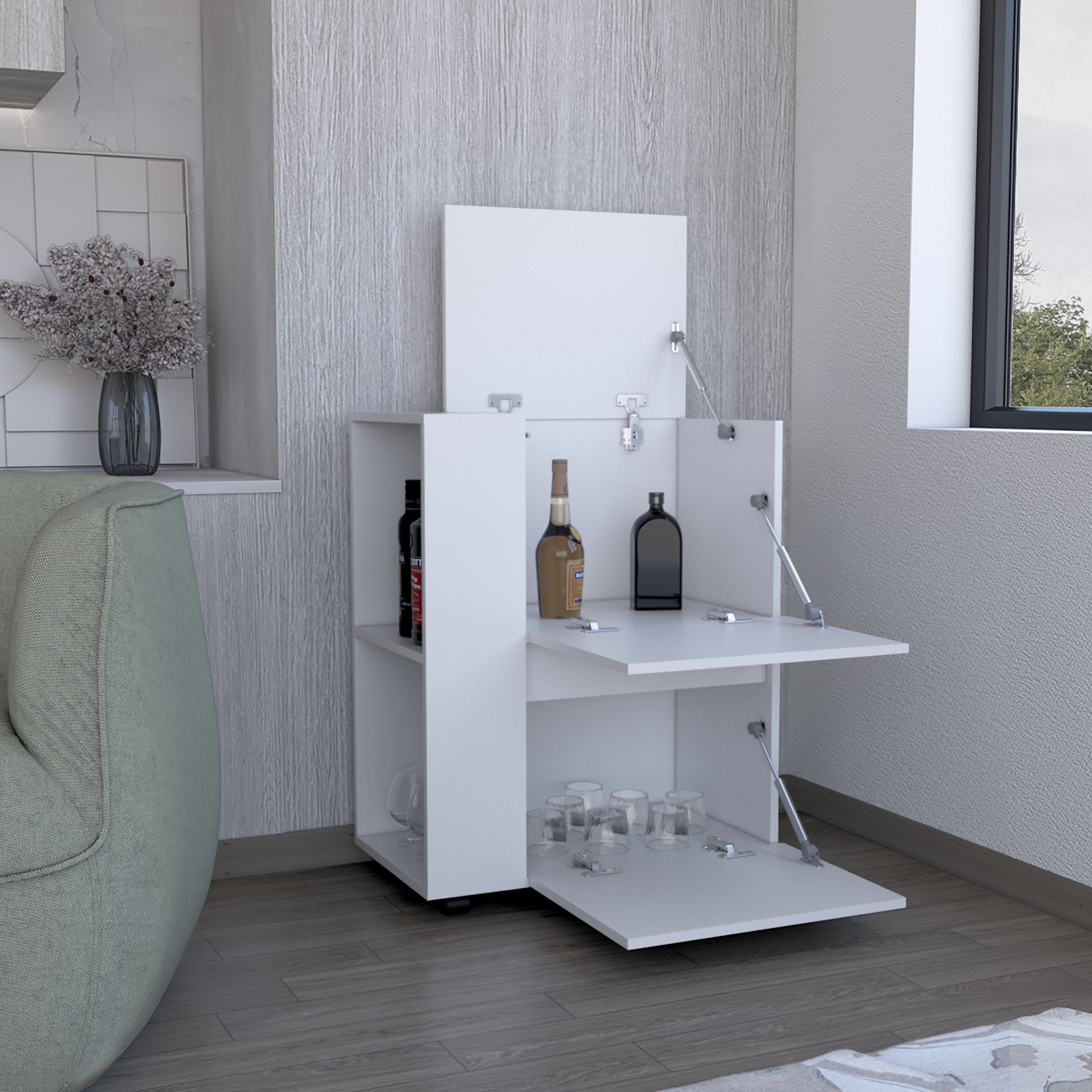 Bring effortless organization and modern farmhouse charm to your entertaining space with this compact white bar cart. Designed for both style and function, it offers versatile storage with pull-down cabinets and open shelving so glassware, bottles, and bar tools are always within reach. Smooth-rolling casters make it easy to move from kitchen to dining area, while a secure brake keeps the cart steady when in use.