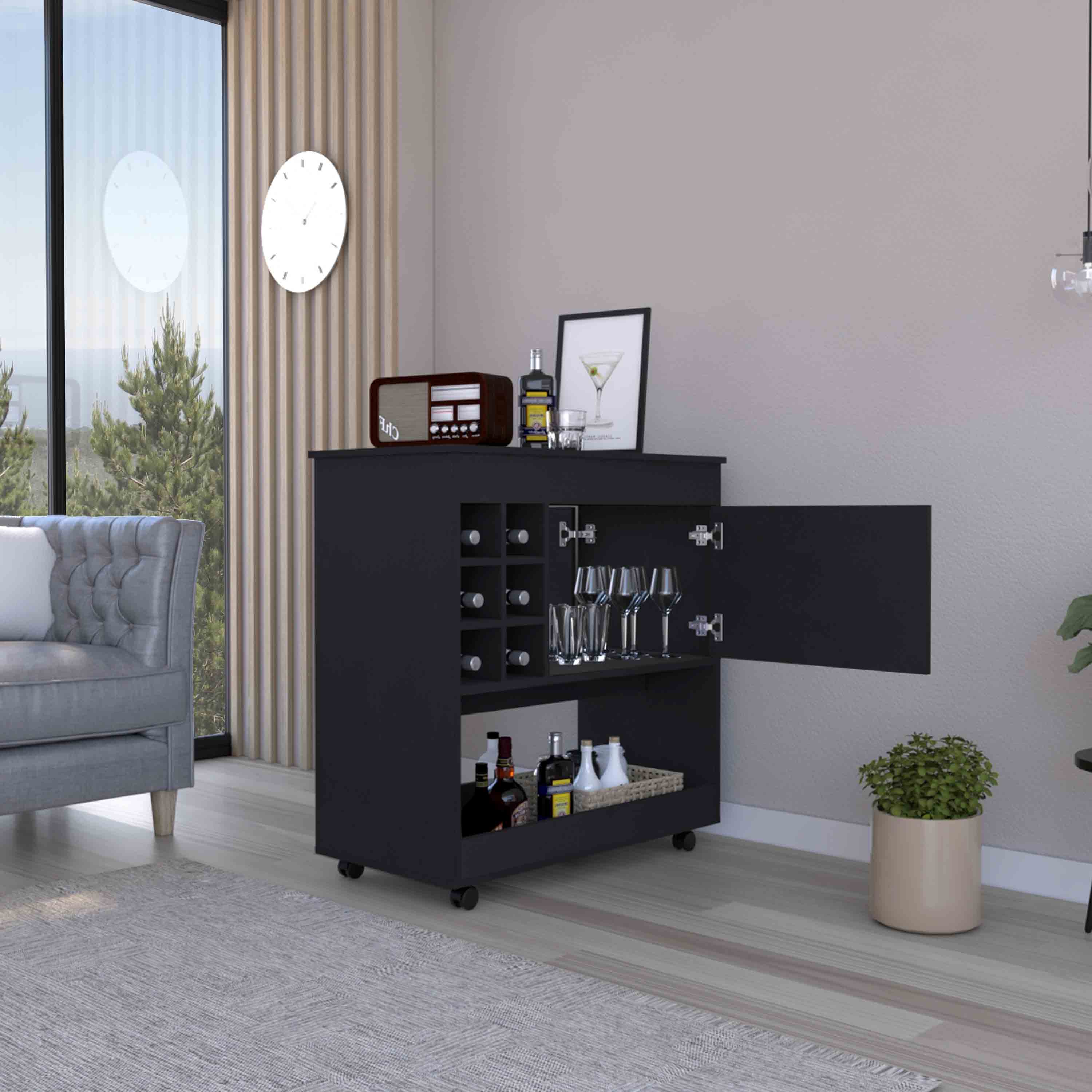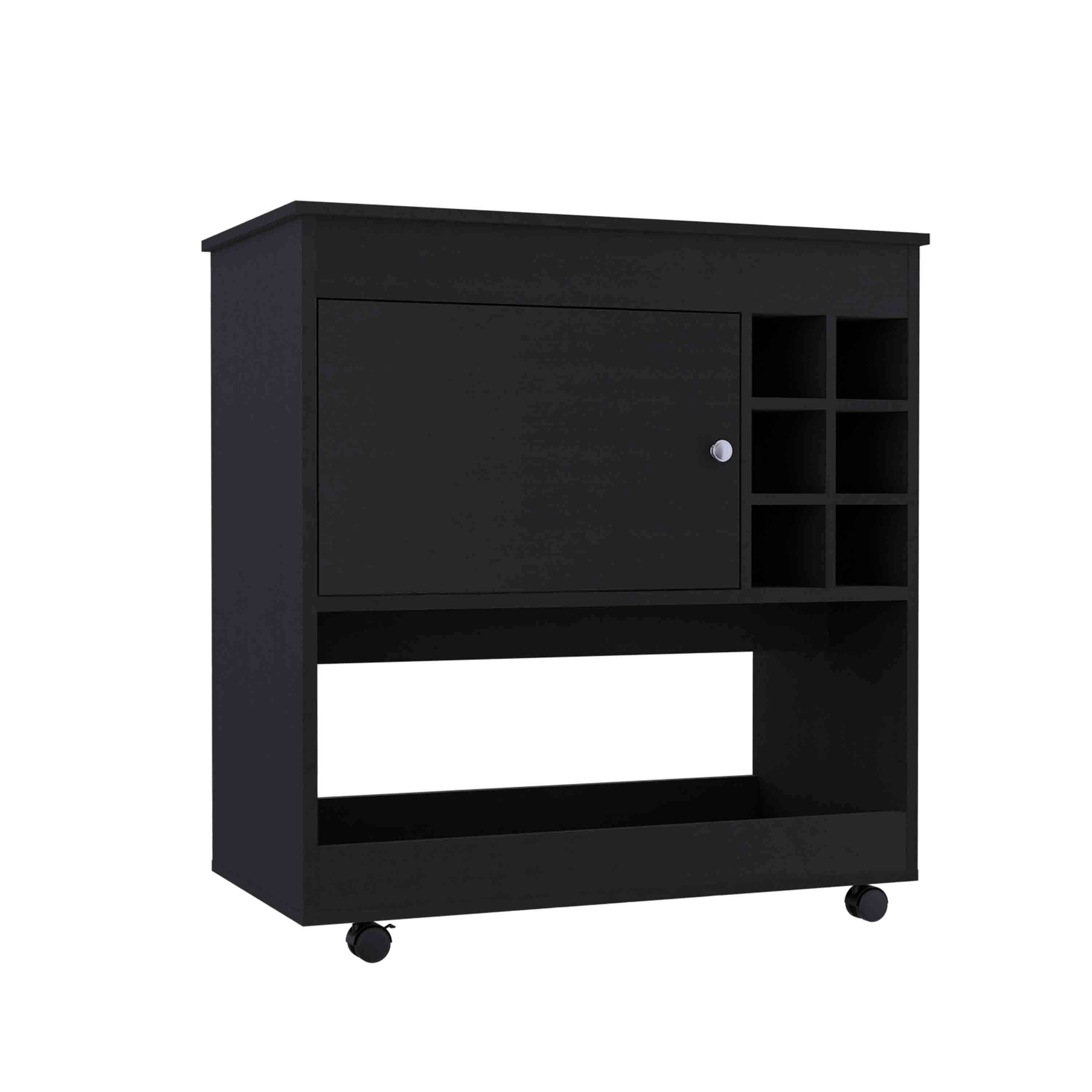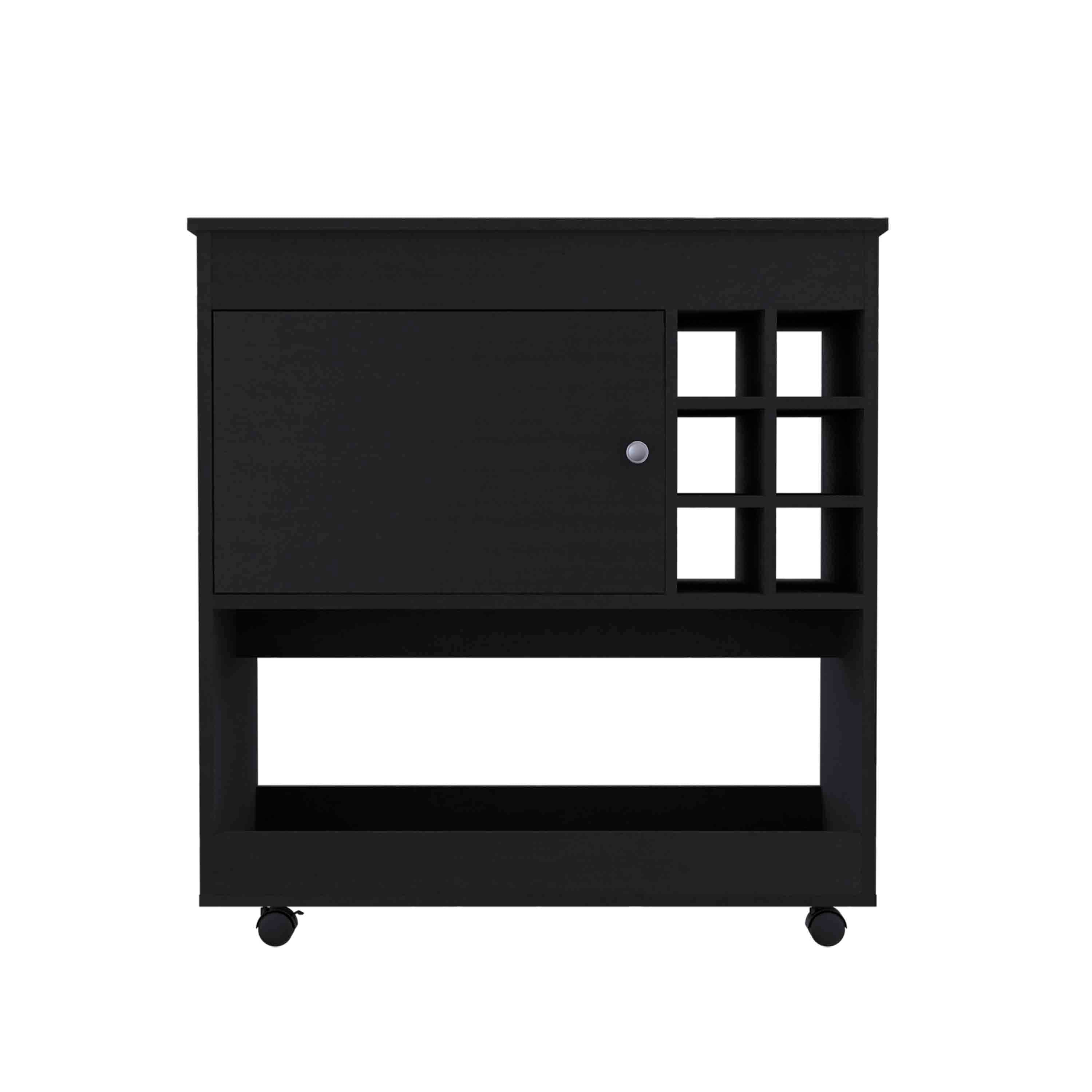 Stylish and functional, the Camelia Bar Cart blends contemporary design with practical storage to keep your barware and bottles organized and accessible. Crafted from durable particle board with a sleek black finish, this compact cart features a generous top surface, a lower shelf, a six-bottle wine cubby, and an enclosed cabinet—perfect for entertaining, small spaces, or adding a polished accent to your dining or living area.