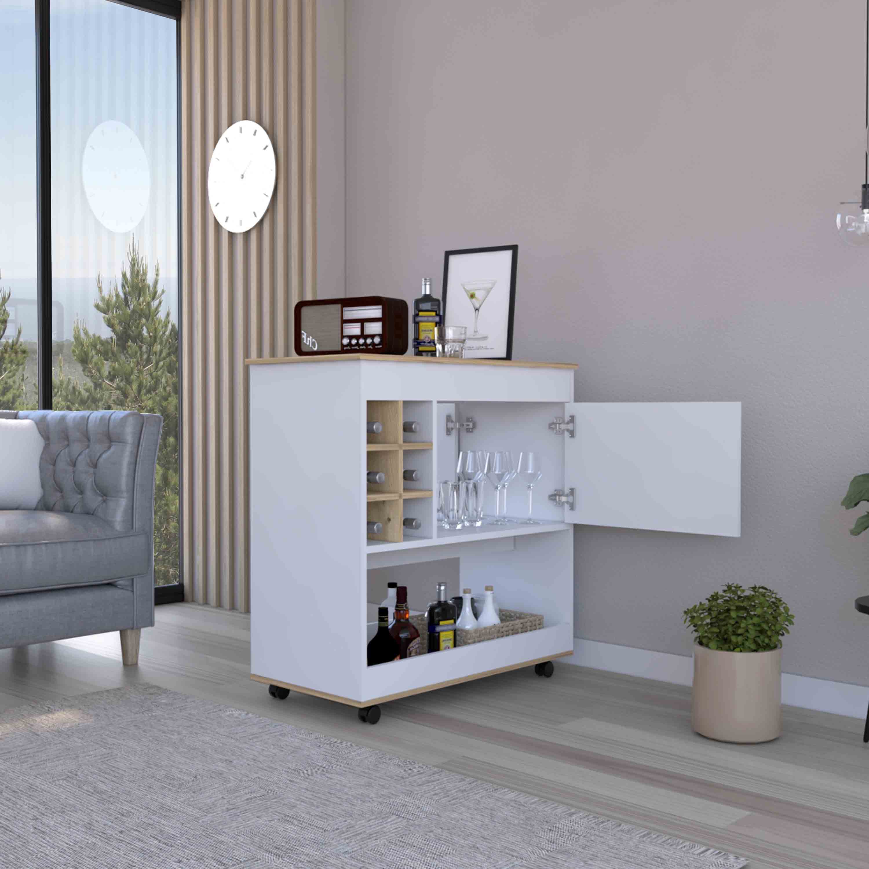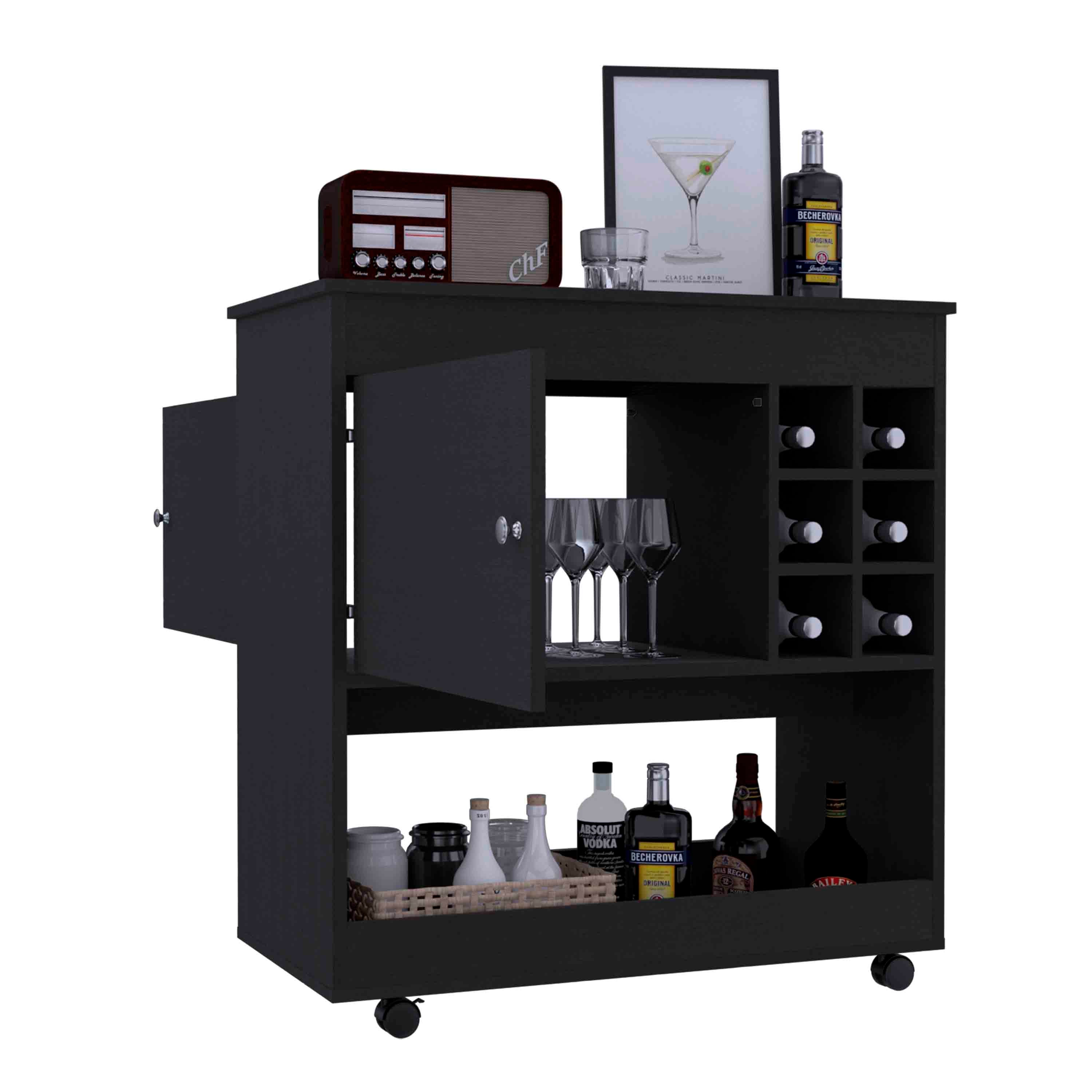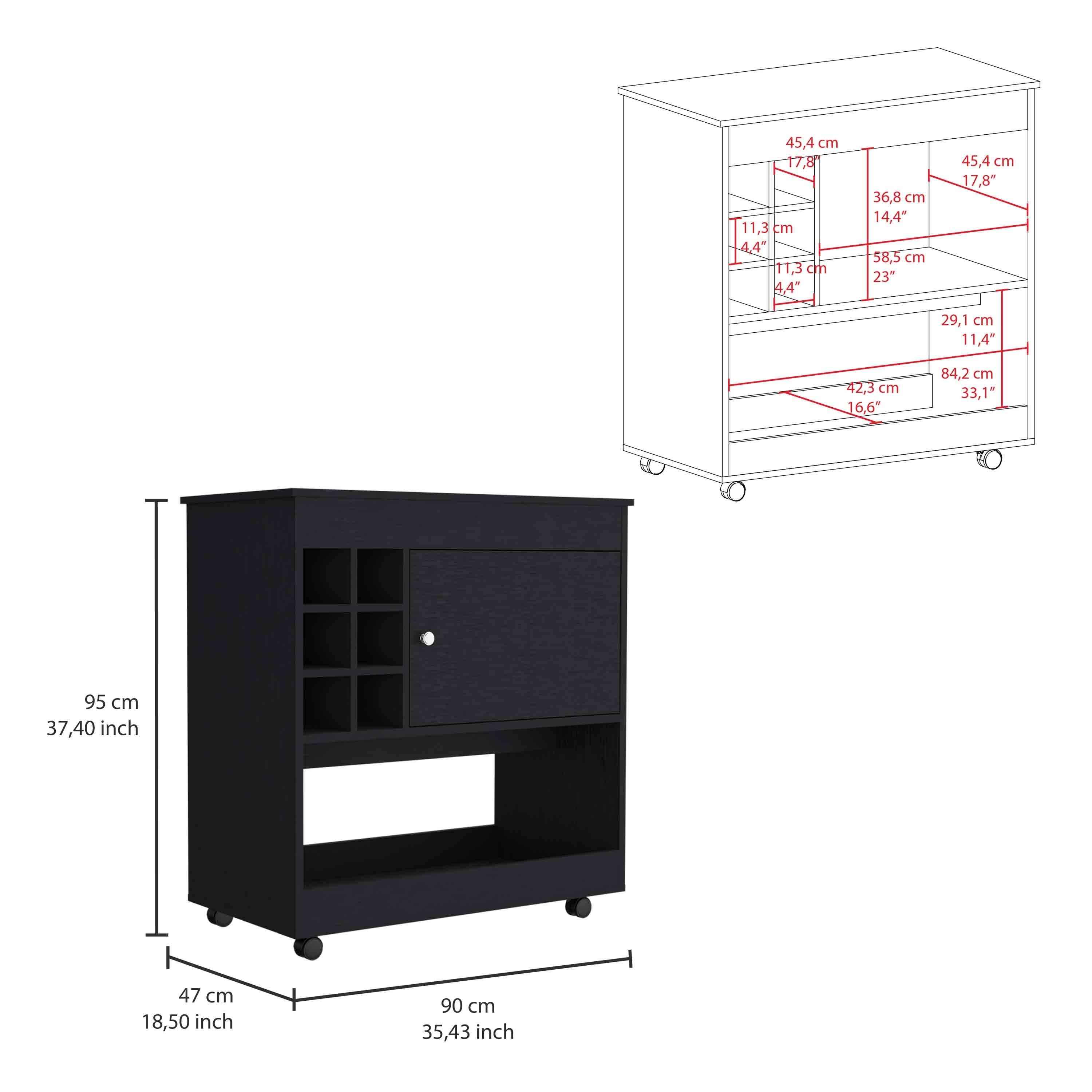 Stylish and functional, the Camelia Bar Cart blends contemporary design with practical storage to keep your barware and bottles organized and accessible. Crafted from durable particle board with a sleek black finish, this compact cart features a generous top surface, a lower shelf, a six-bottle wine cubby, and an enclosed cabinet—perfect for entertaining, small spaces, or adding a polished accent to your dining or living area.