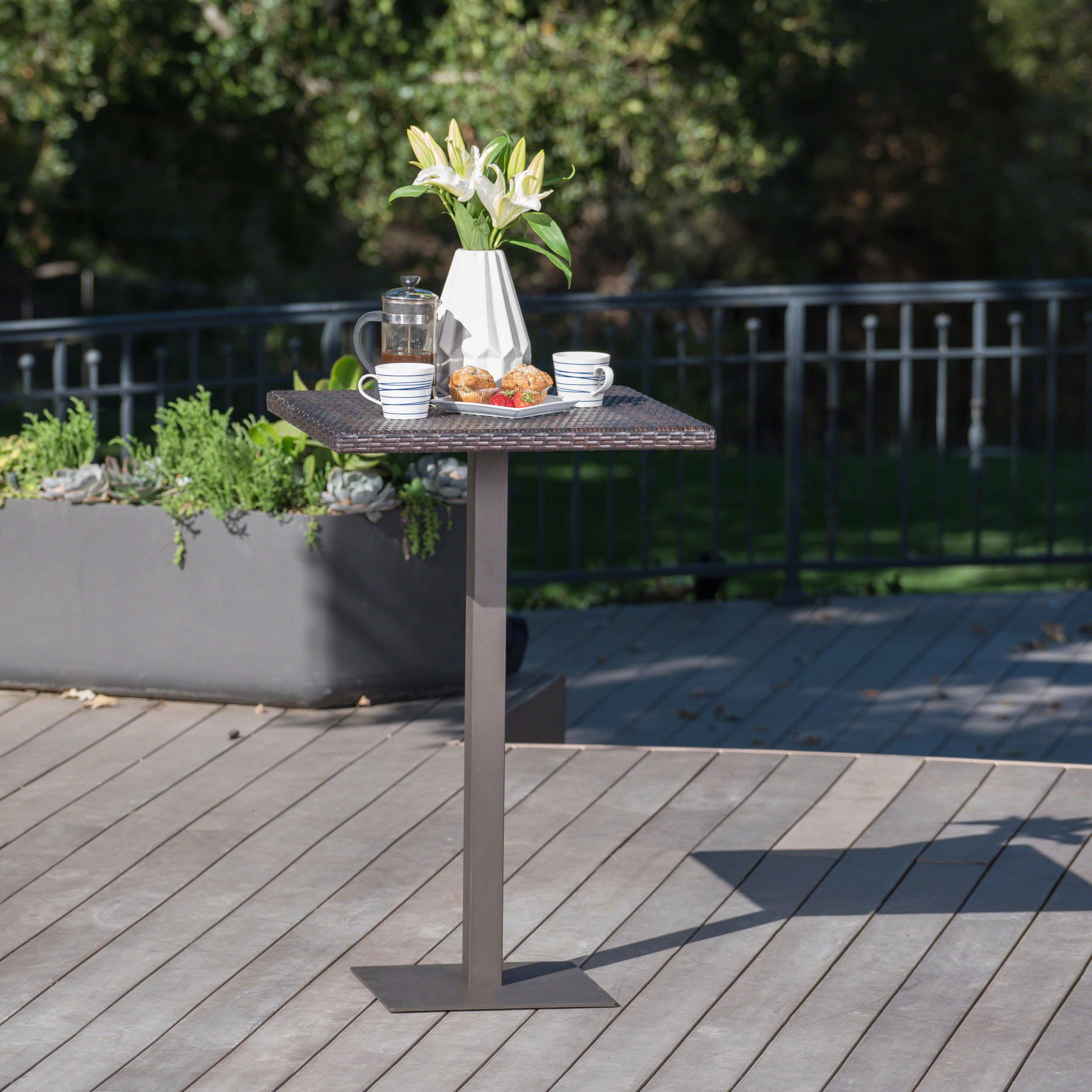 This stylish rattan bar table brings casual sophistication to indoor or outdoor entertaining with durable construction and a warm brown multi finish. Handcrafted polyethylene wicker wraps a powder-coated iron frame for weather resistance and stability, making it a versatile centerpiece for patios, balconies, or breakfast nooks.