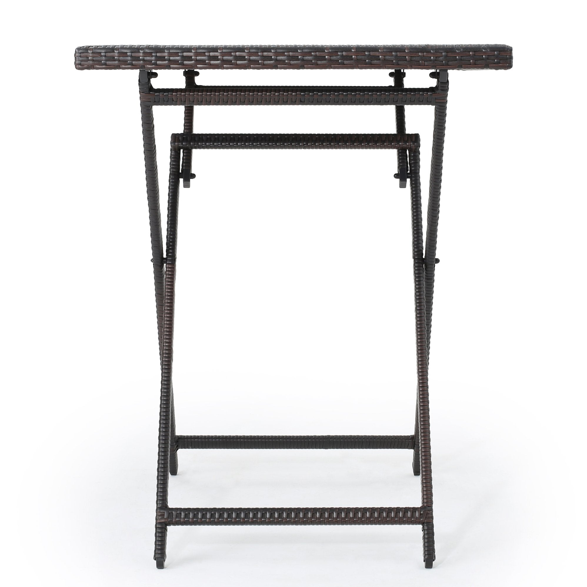 - This folding, outdoor bar table is a great addition for any patio. Made with powder-coated iron for a sturdy frame and wrapped in top quality wicker, this table is a great addition for any backyard. Use this table for family dinners outside or as extra table space at events for extra cups and plates for your guests. The uses of this folding wicker table are endless. Discover your use today!