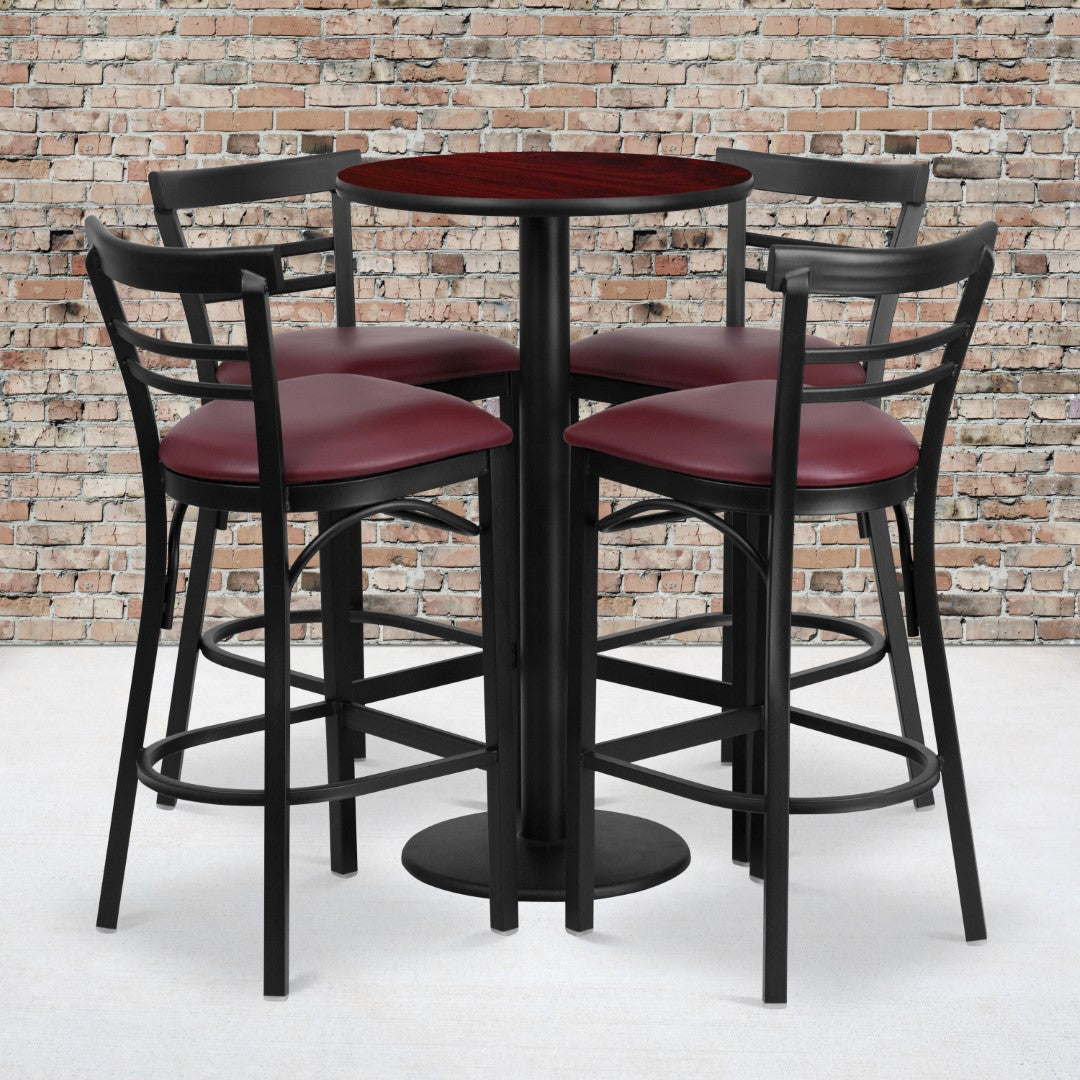 - Includes 4 Barstools, Round Table Top, and Round Base