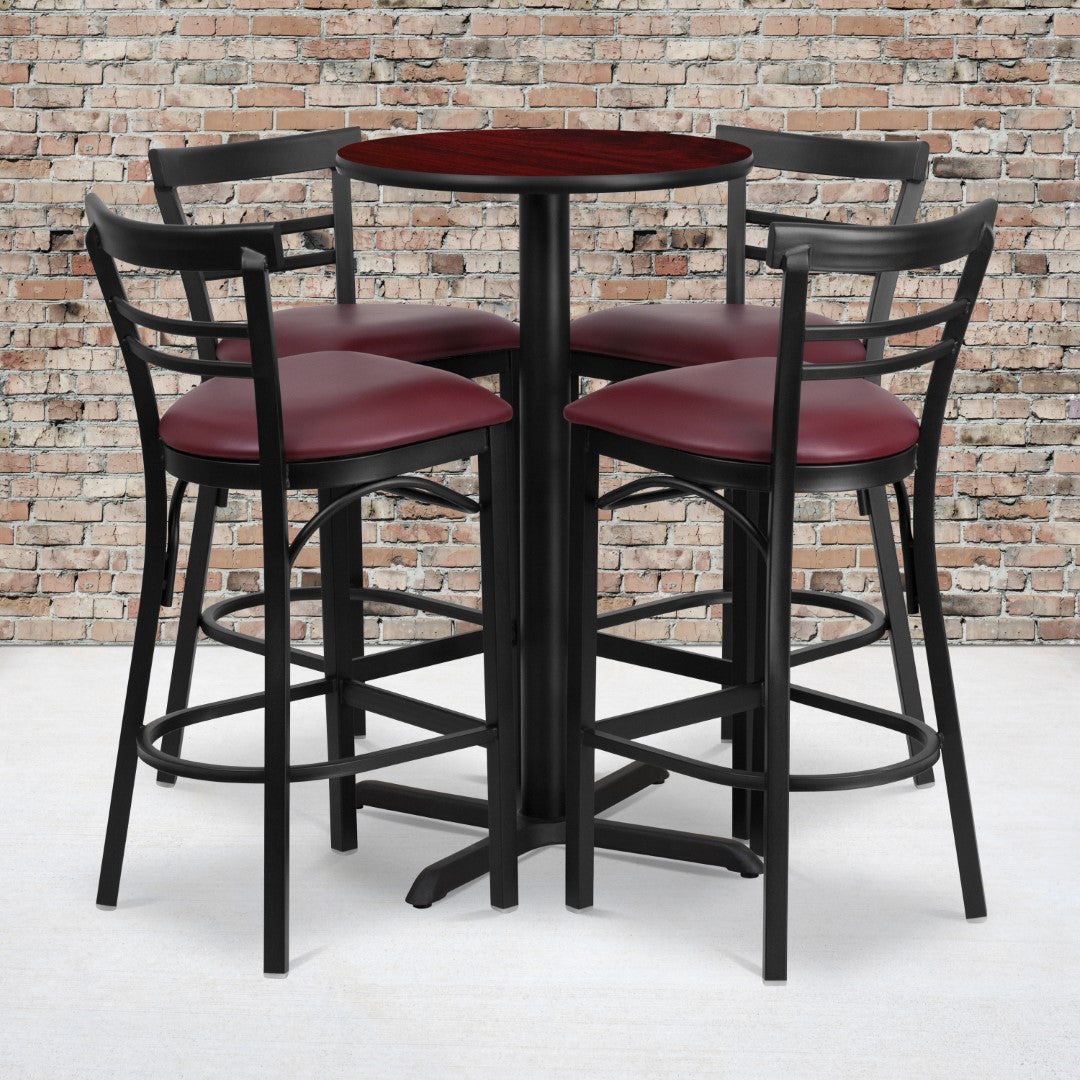 - Set Includes 4 Barstools, Round Table Top, and X-Base
