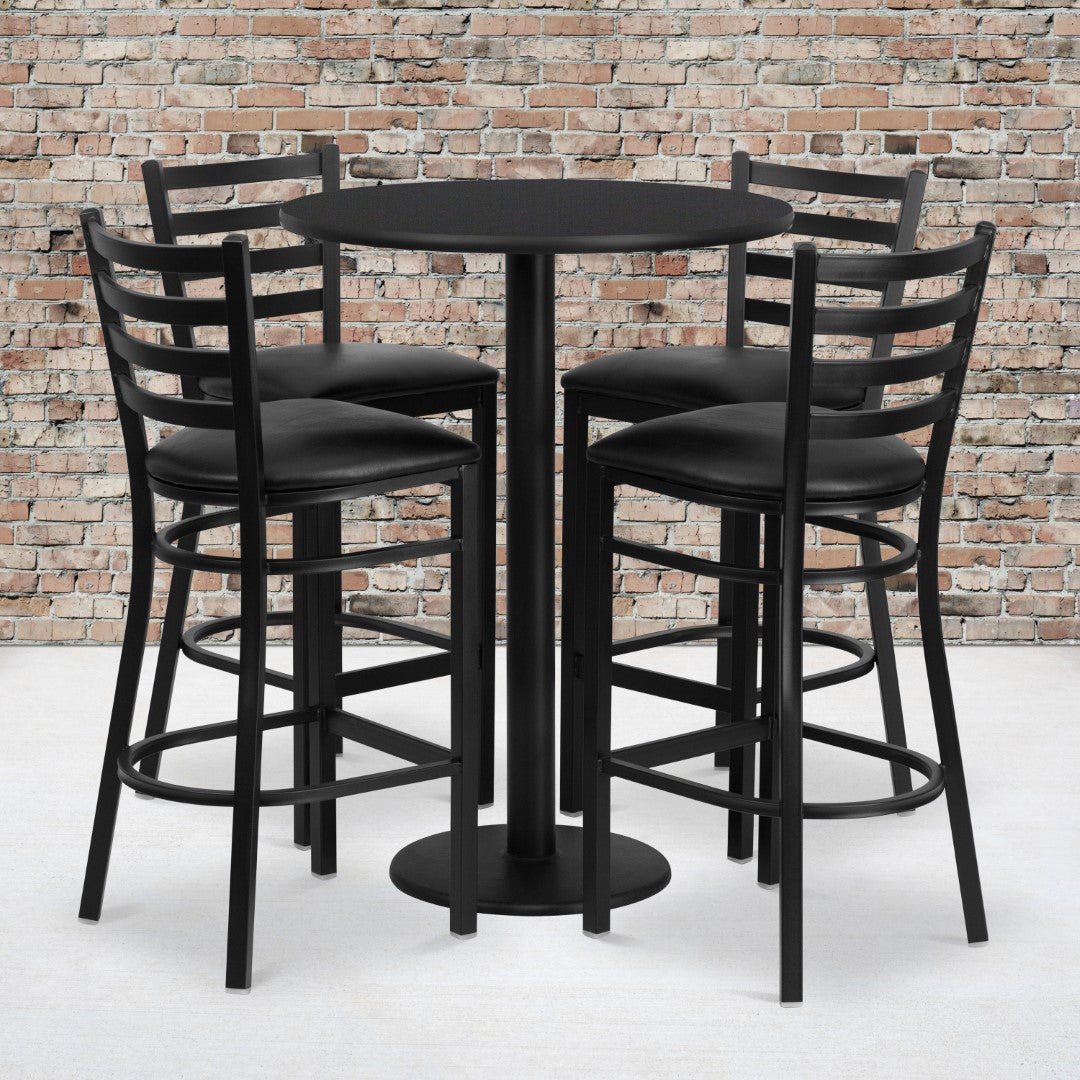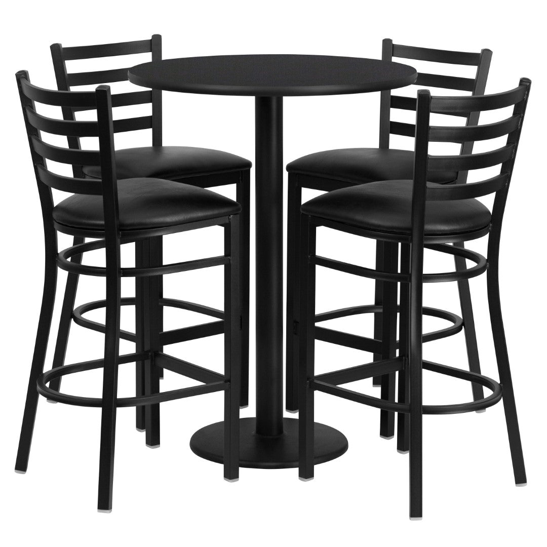 - Set Includes 4 Barstools, Round Table Top, and Round Base