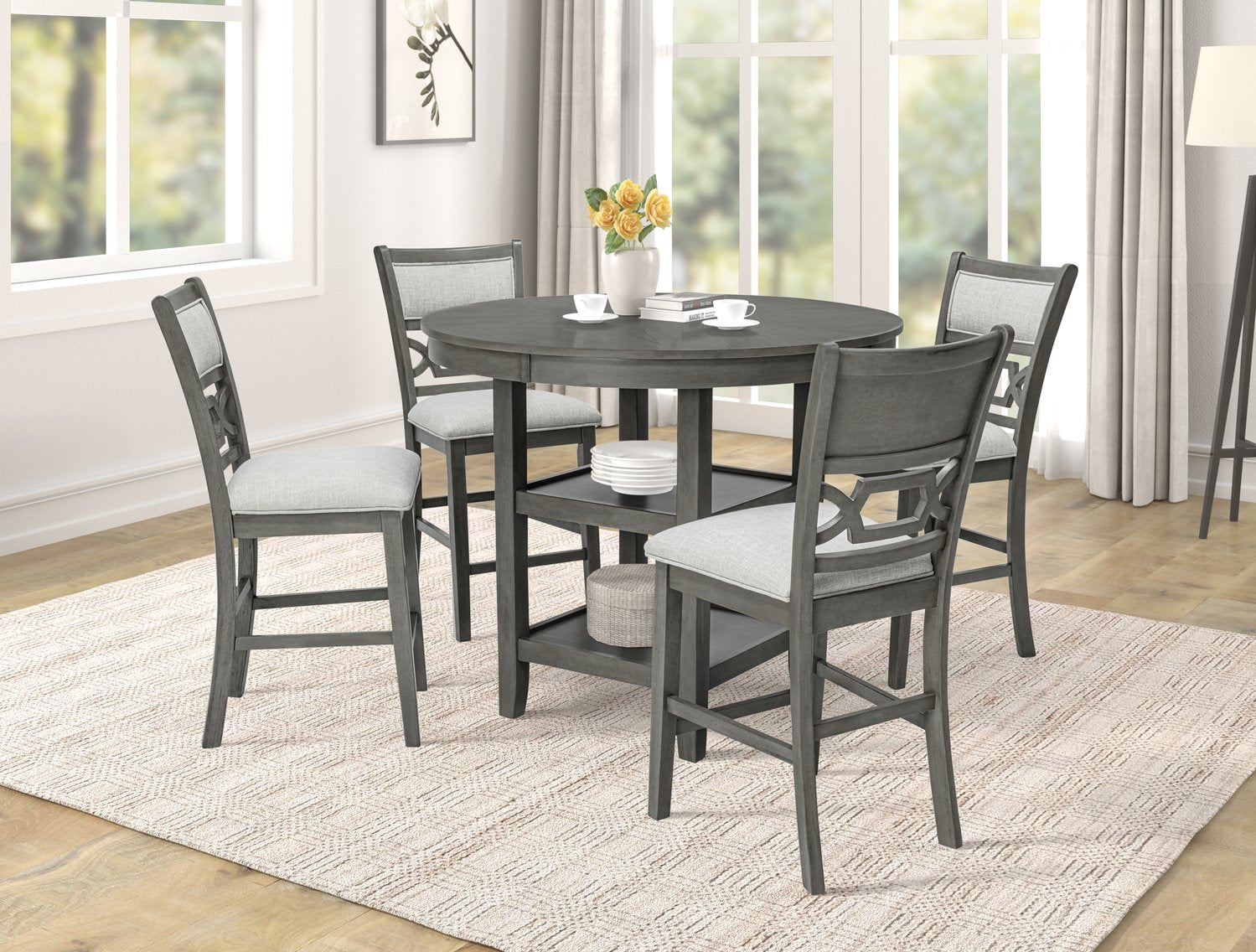 Refresh your dining area with this stylish and space-smart 5-piece counter-height pub set, designed for casual meals and intimate entertaining. Crafted from durable wood with a warm finish, the round table and four matching chairs combine comfortable seating, practical lower storage shelves, and a compact footprint—perfect for kitchen nooks, apartments, or breakfast rooms.