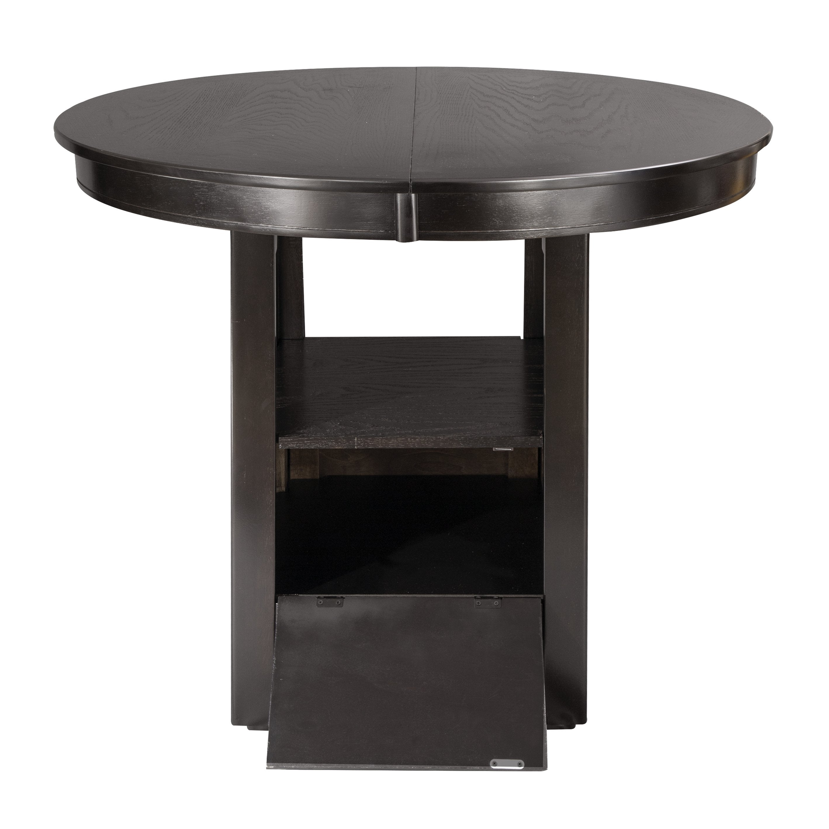 Bring timeless mission-style charm to your casual dining space with this counter-height dining table from the Junipero Collection. Crafted in a rich dark cherry finish over oak veneer, the table features an oval top with an 18" extension leaf, a pedestal base with framed detailing, and a built-in storage compartment accessible behind a drop-panel door — combining traditional aesthetics with everyday functionality.