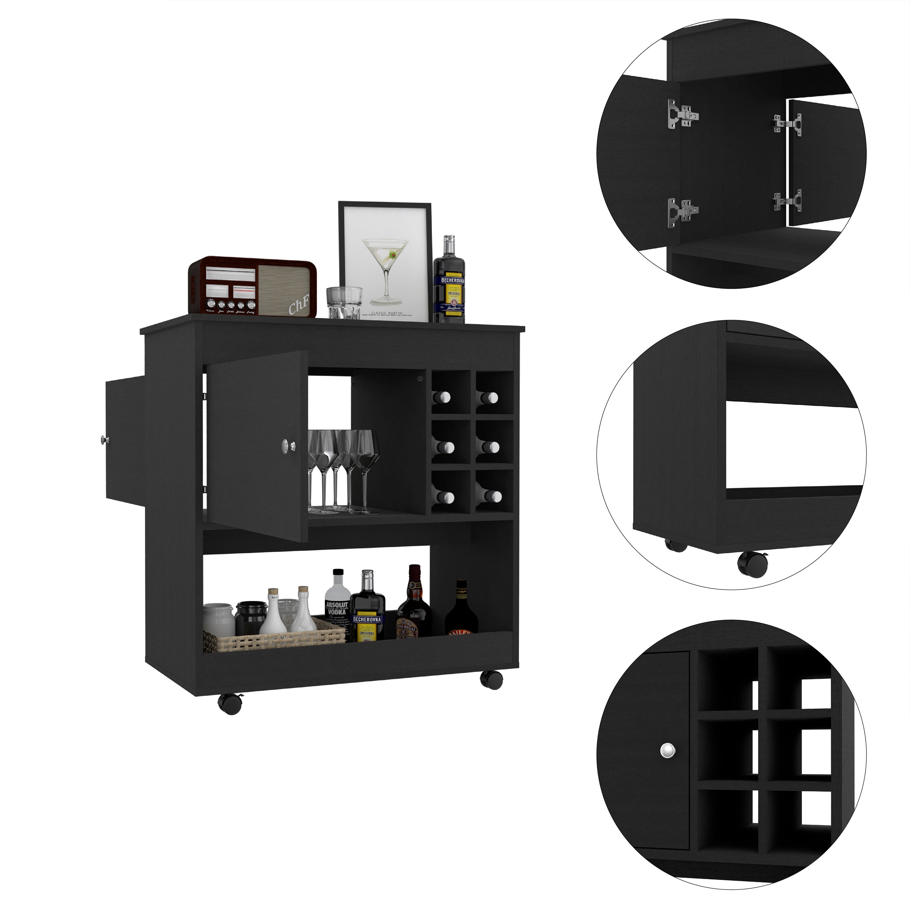 Bring effortless style and organized functionality to your entertaining space with the Lotus Bar Cart. Designed for compact storage and smooth mobility, this sleek black cart combines a six-bottle cubby layout, enclosed cabinet storage, and roomy shelving to keep glassware, bottles, and accessories neatly arranged and easily accessible.