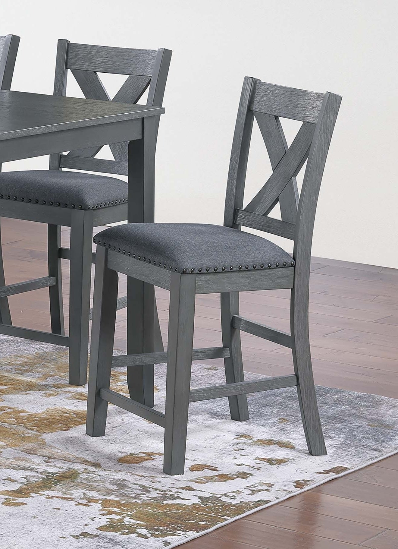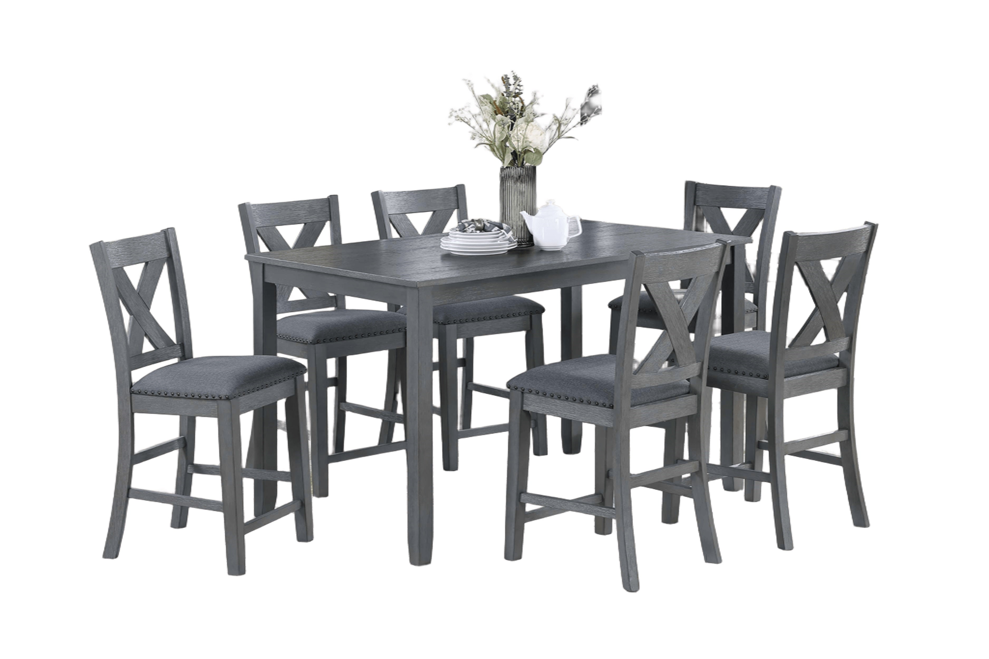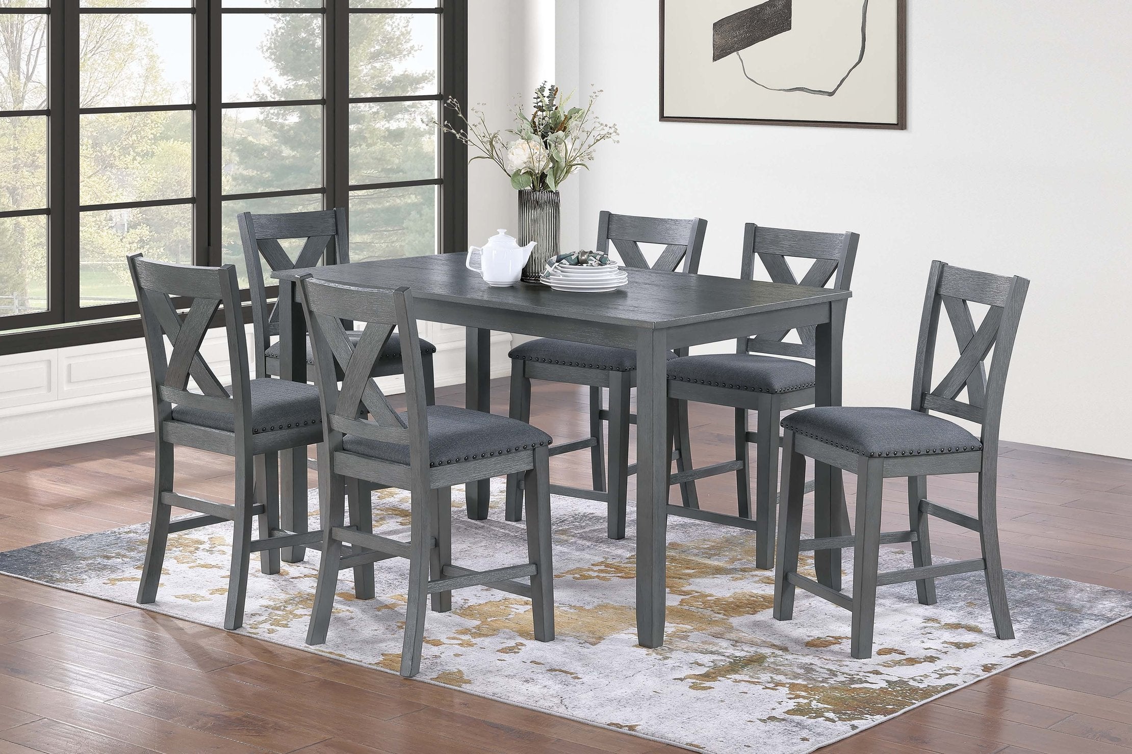 Gather friends and family around a stylish and comfortable dining set that blends modern lines with subtle farmhouse charm. This 7-piece counter-height dining collection features a spacious rectangular table and six cushioned X-cross back chairs with nailhead trim, offering a cohesive look that suits casual meals, game nights, or entertaining guests.