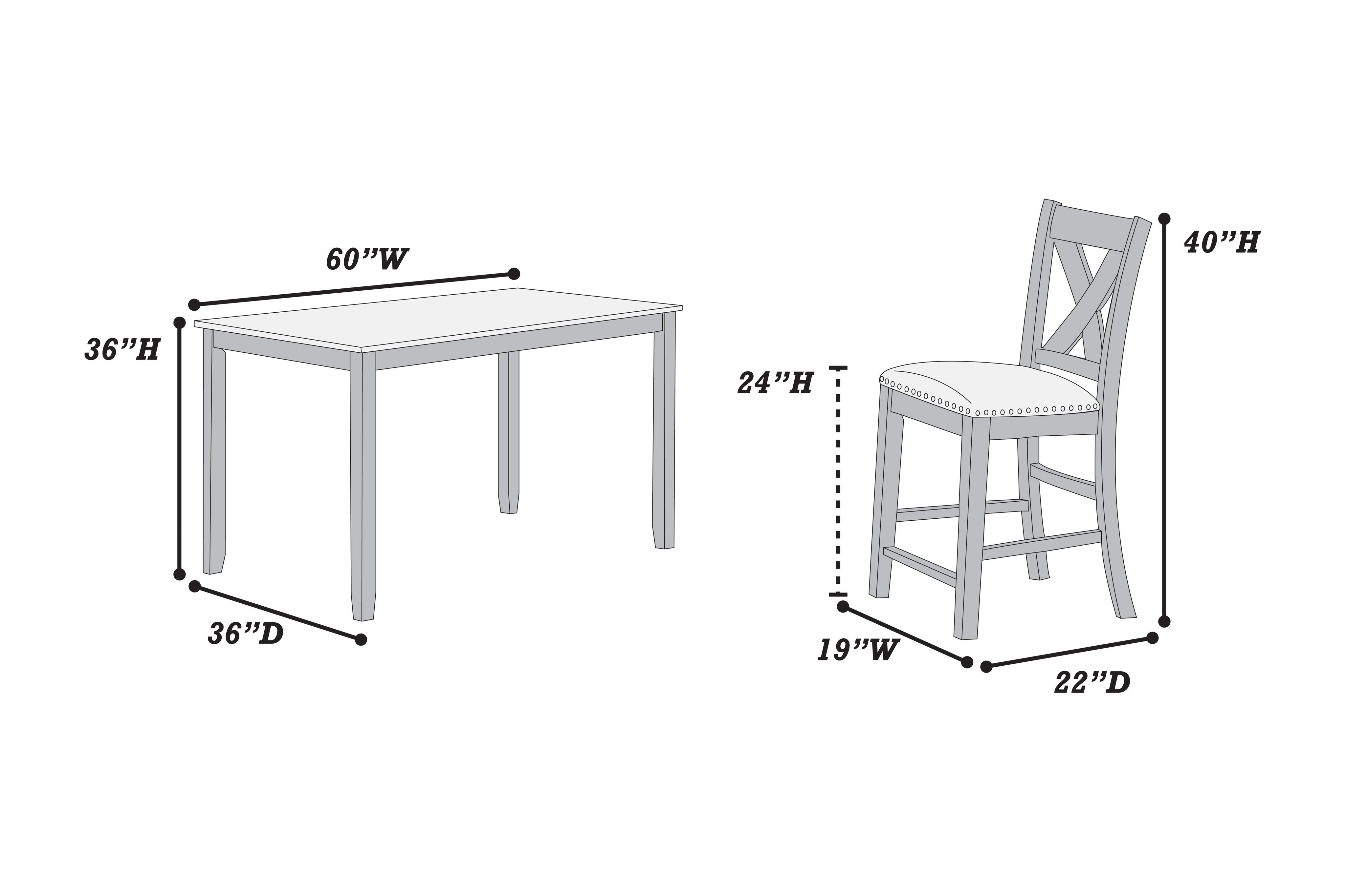 - Dimensions (prominent): Counter Height Dining Table: 60" L x 36" W x 36" H; High Chairs: 19" W x 22" D x 40" H, Seat Height: 24" H. (Also listed separately as 40" L x 13" W x 64" H.)