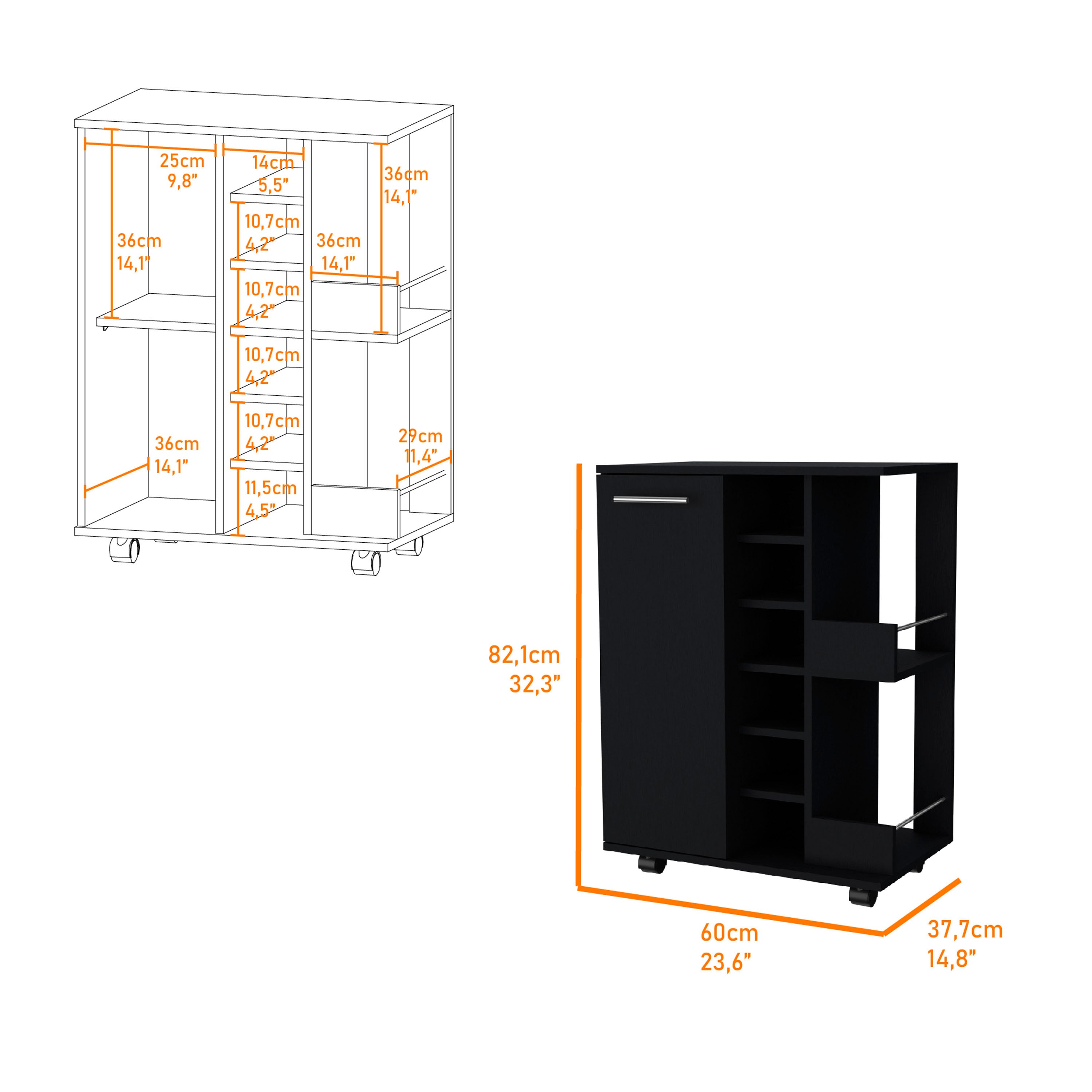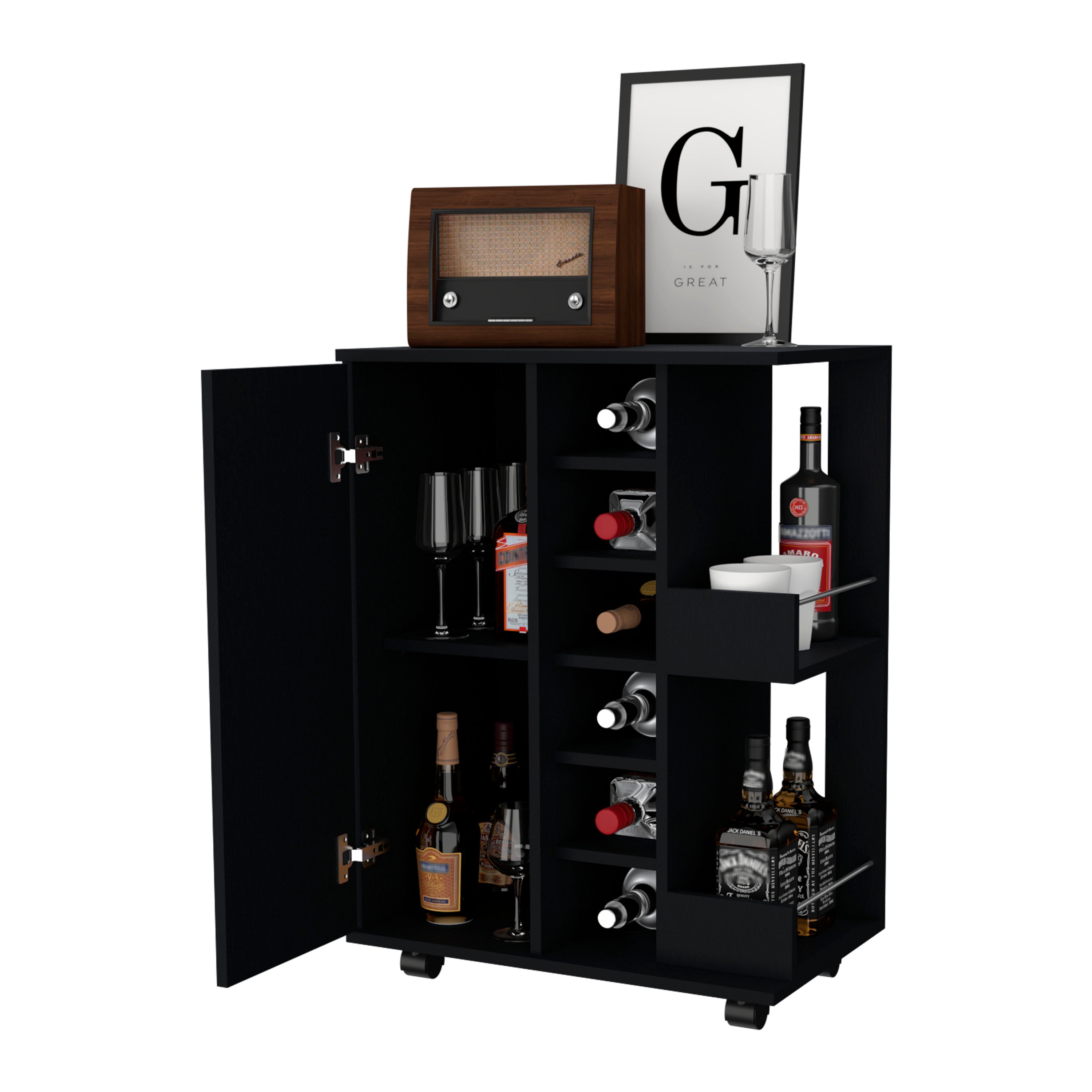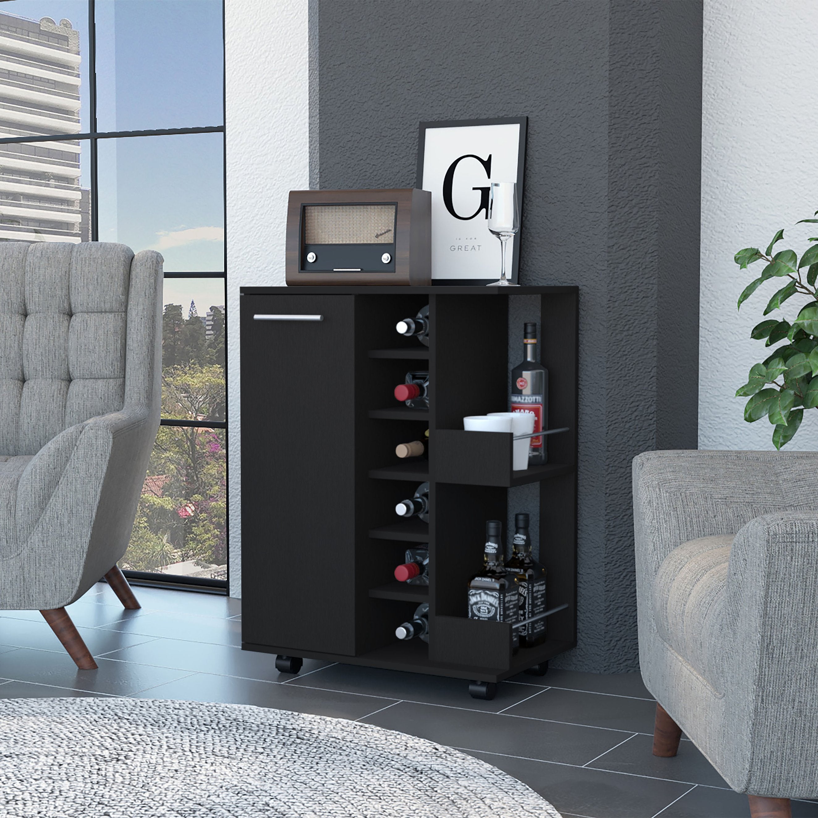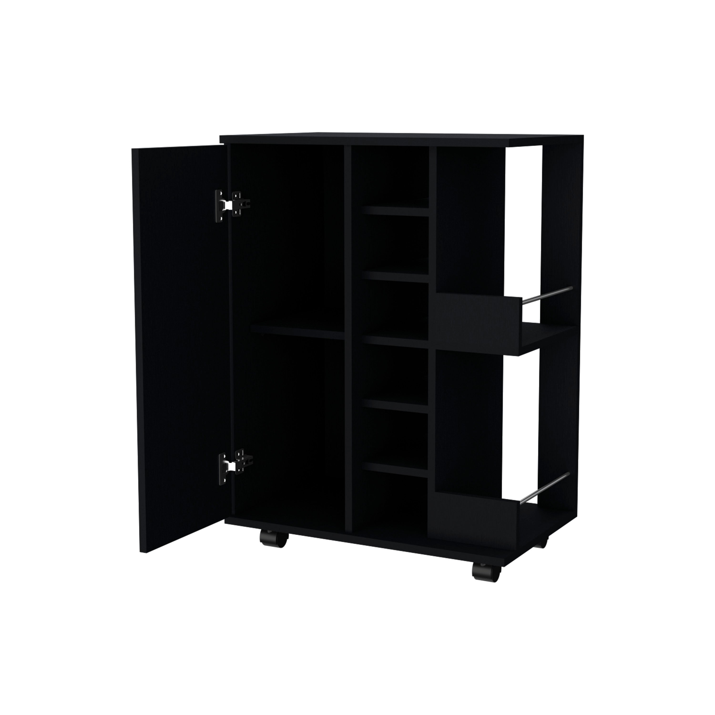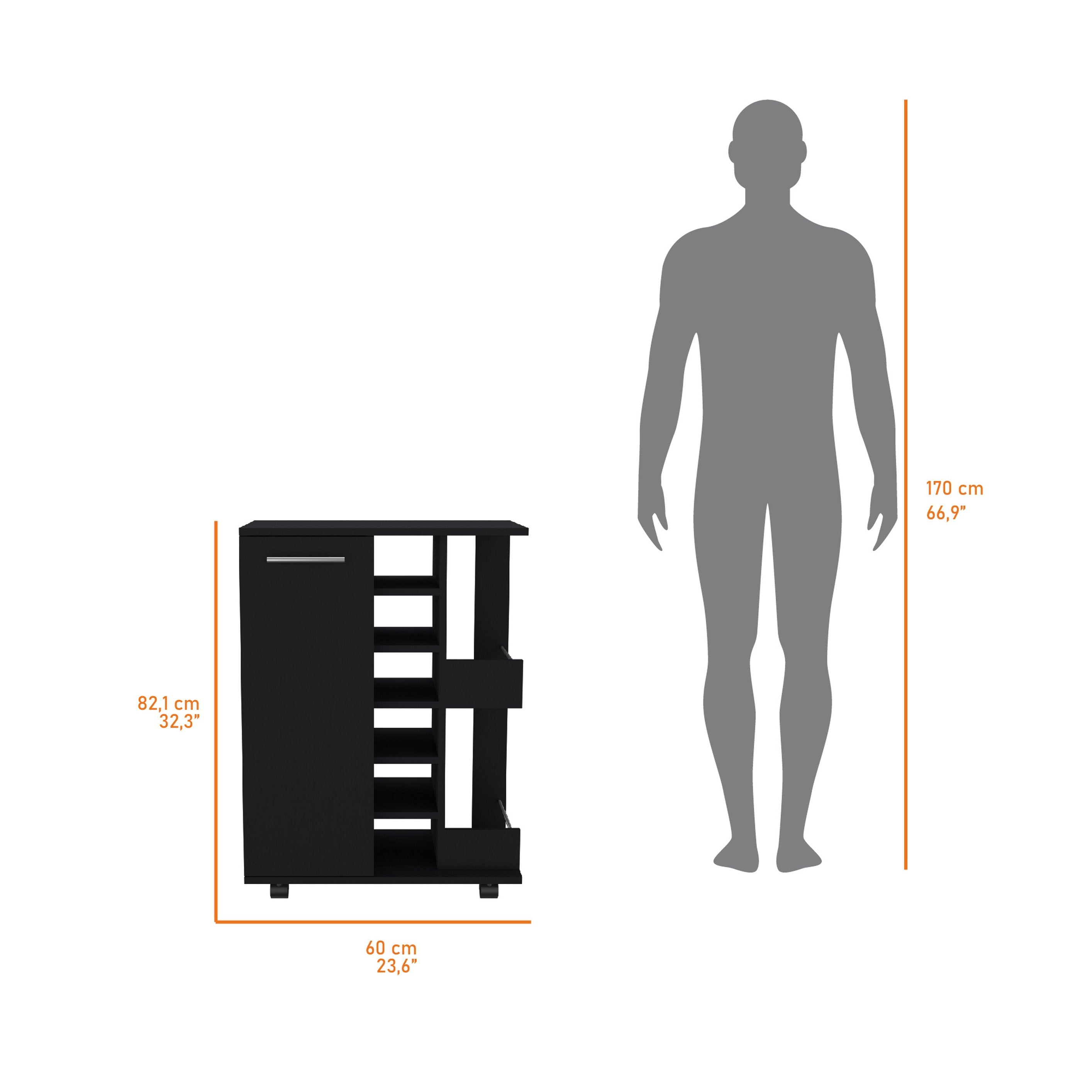 Bring style and convenience to your gatherings with this sleek Tennessee bar cart in Black Wenge. Thoughtfully designed for entertaining and everyday use, it combines organized storage, secure mobility, and an accessible prep surface so you can serve drinks and snacks with ease wherever the party moves.