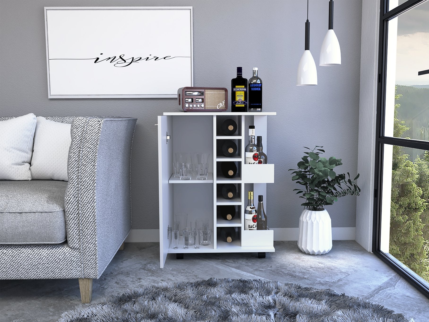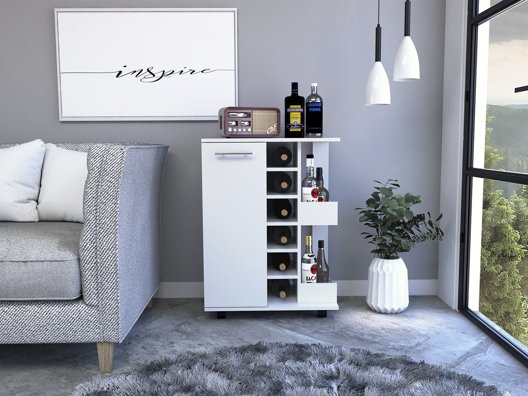Brighten your gatherings and streamline entertaining with this versatile Tennessee bar cart. Designed for both function and style, it offers organized storage for bottles, glassware, and bar tools while remaining easy to move between rooms. Finished in clean white, the cart combines practical features—like a cabinet, bottle cubbies, and locking casters—with a roomy work surface so you can mix drinks and serve guests with confidence.