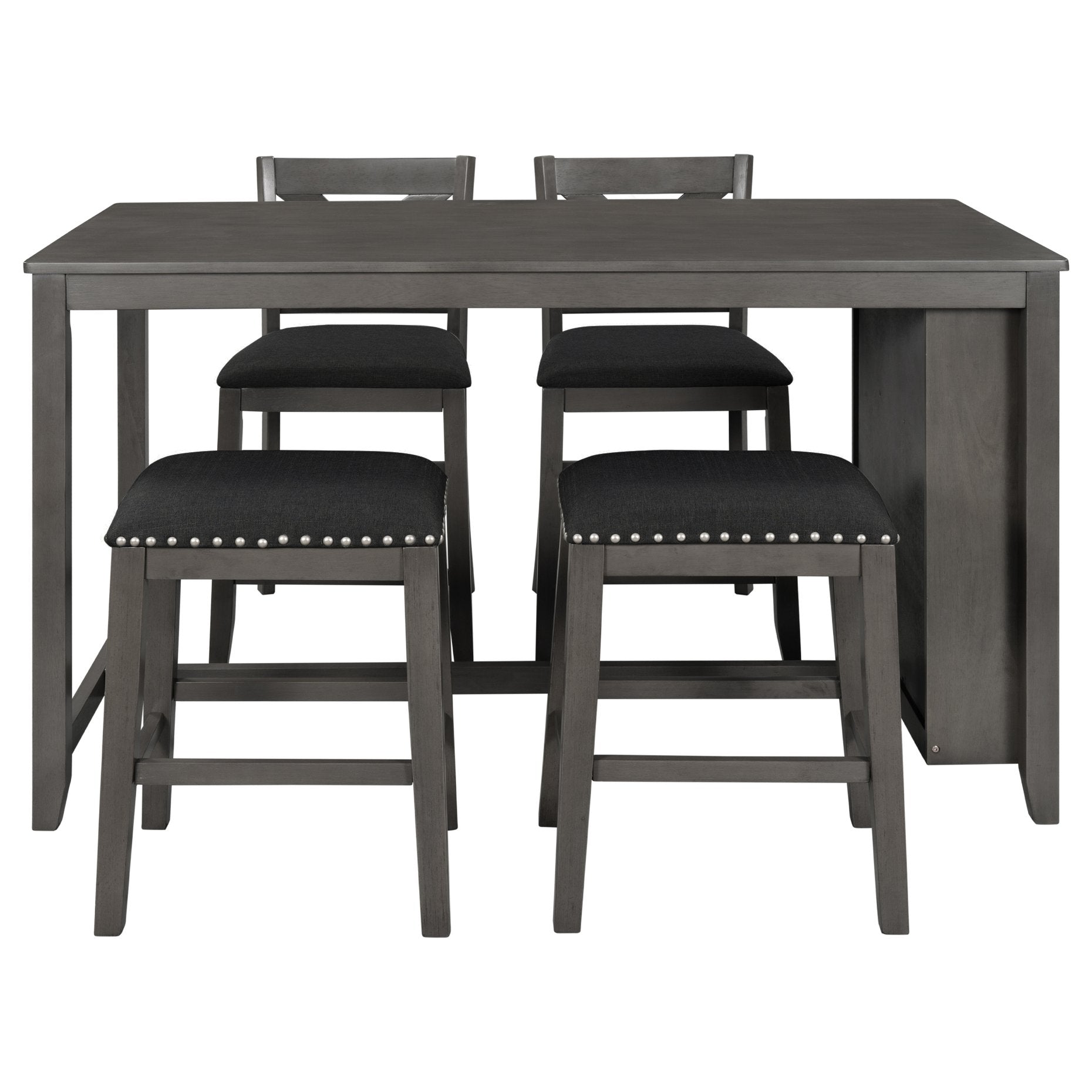 - Set includes: 1 counter-height table, 2 chairs, and 2 stools — seating for four.