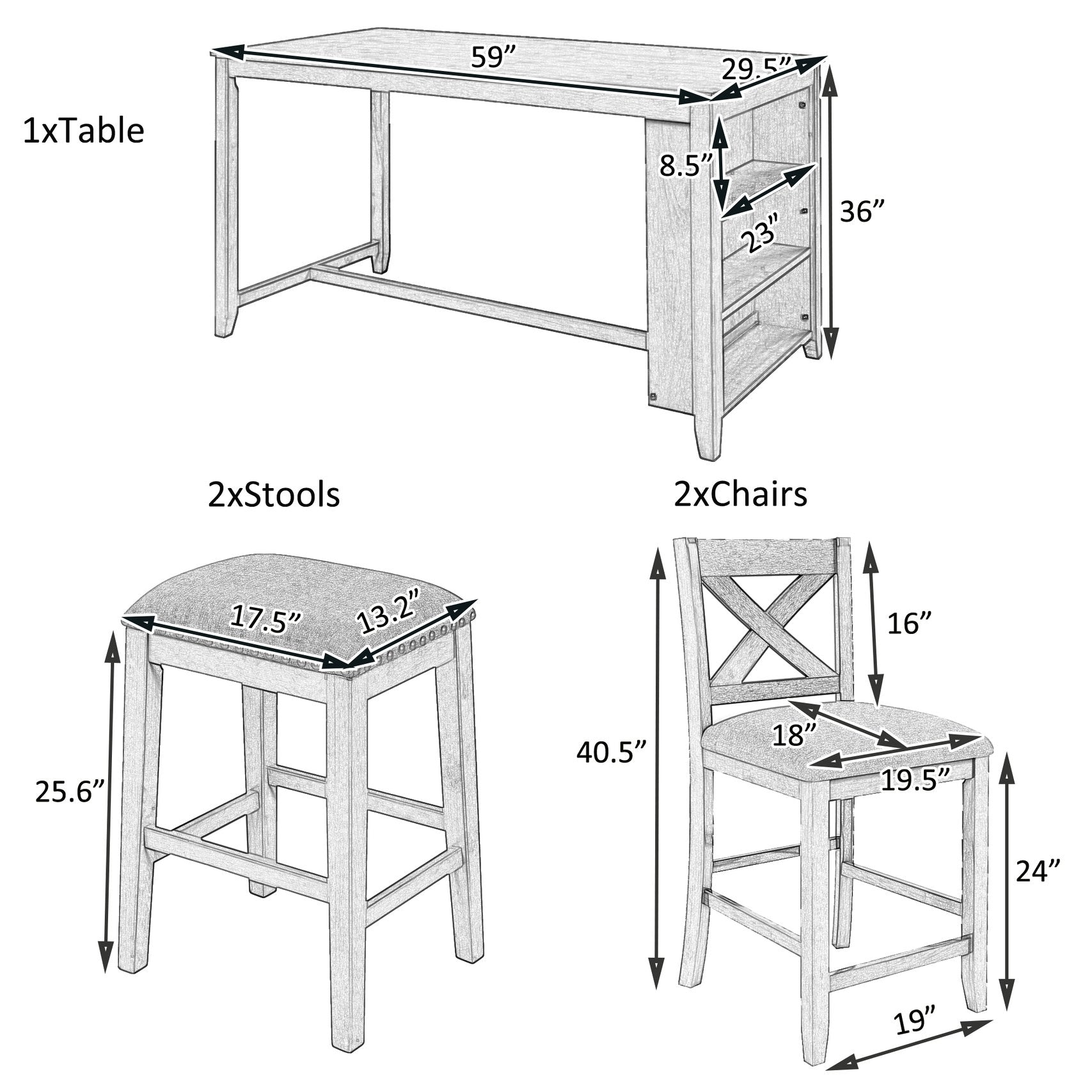 - Product dimensions: Table: 59 x 29.5 x 36 in (L x W x H); Chair: 19.5 x 18 x 40.5 in (L x W x H); Stool: 17.5 x 13.2 x 25.6 in (L x W x H). (Also listed as 27.76 x 17.72 x 7.28 in in product details — see notes.)