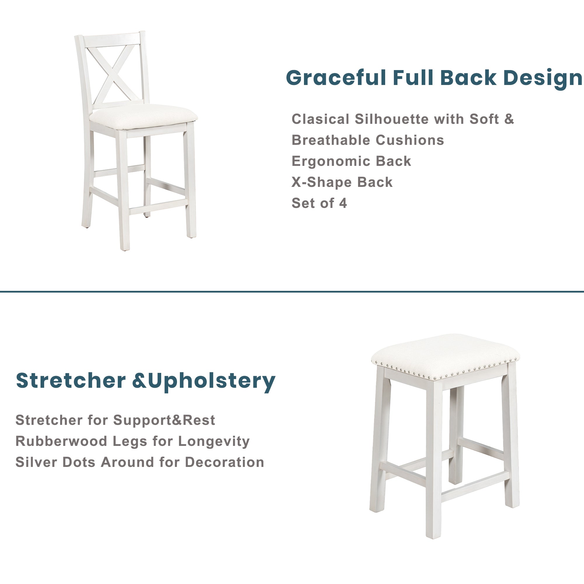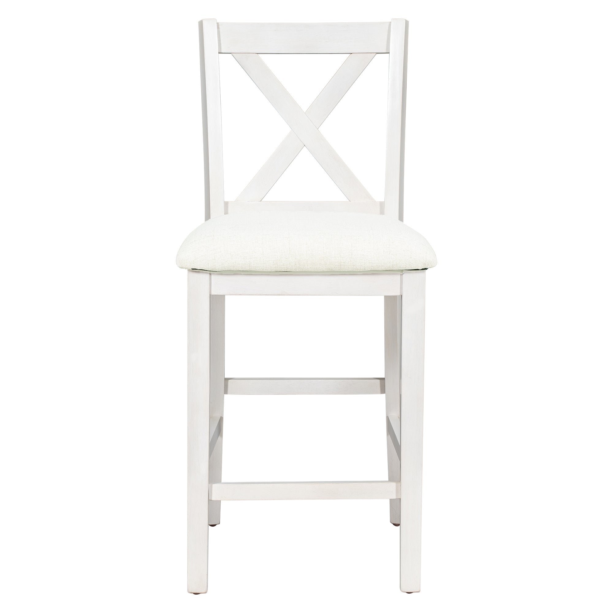 - [Counter Height Table Set] Try this counter height table set when tired of common standard- height ones. In a rustic vintage white finish, there is no doubt that the set will decorate your home in irresistible charm.