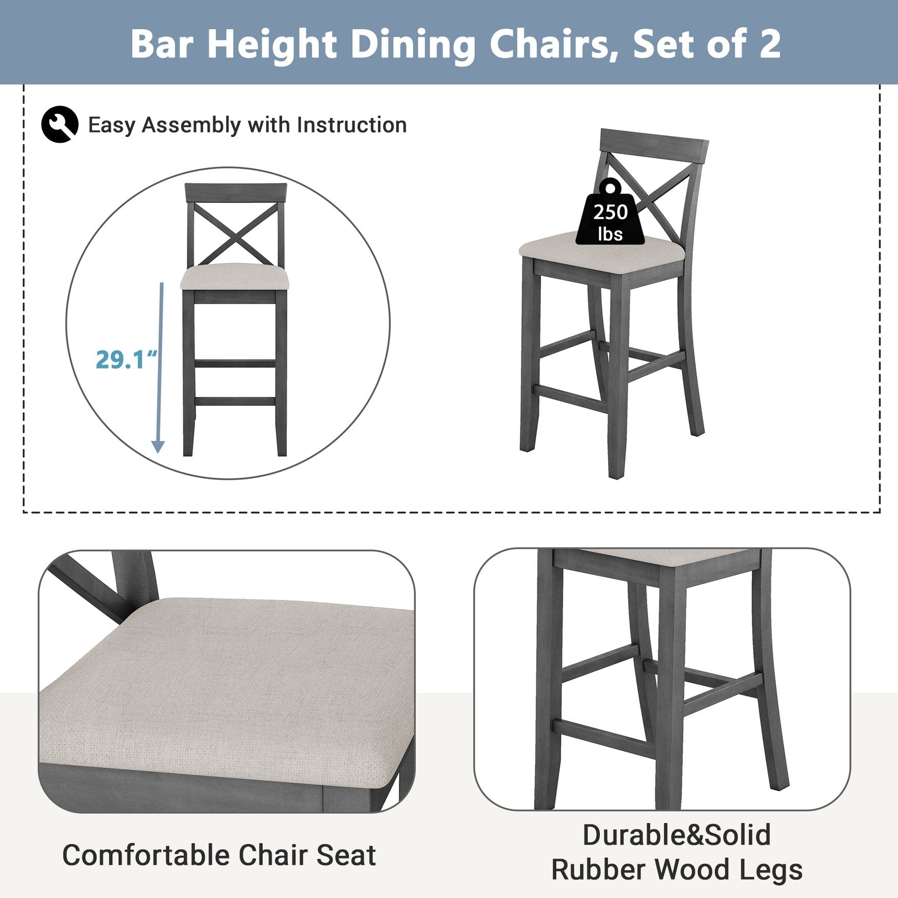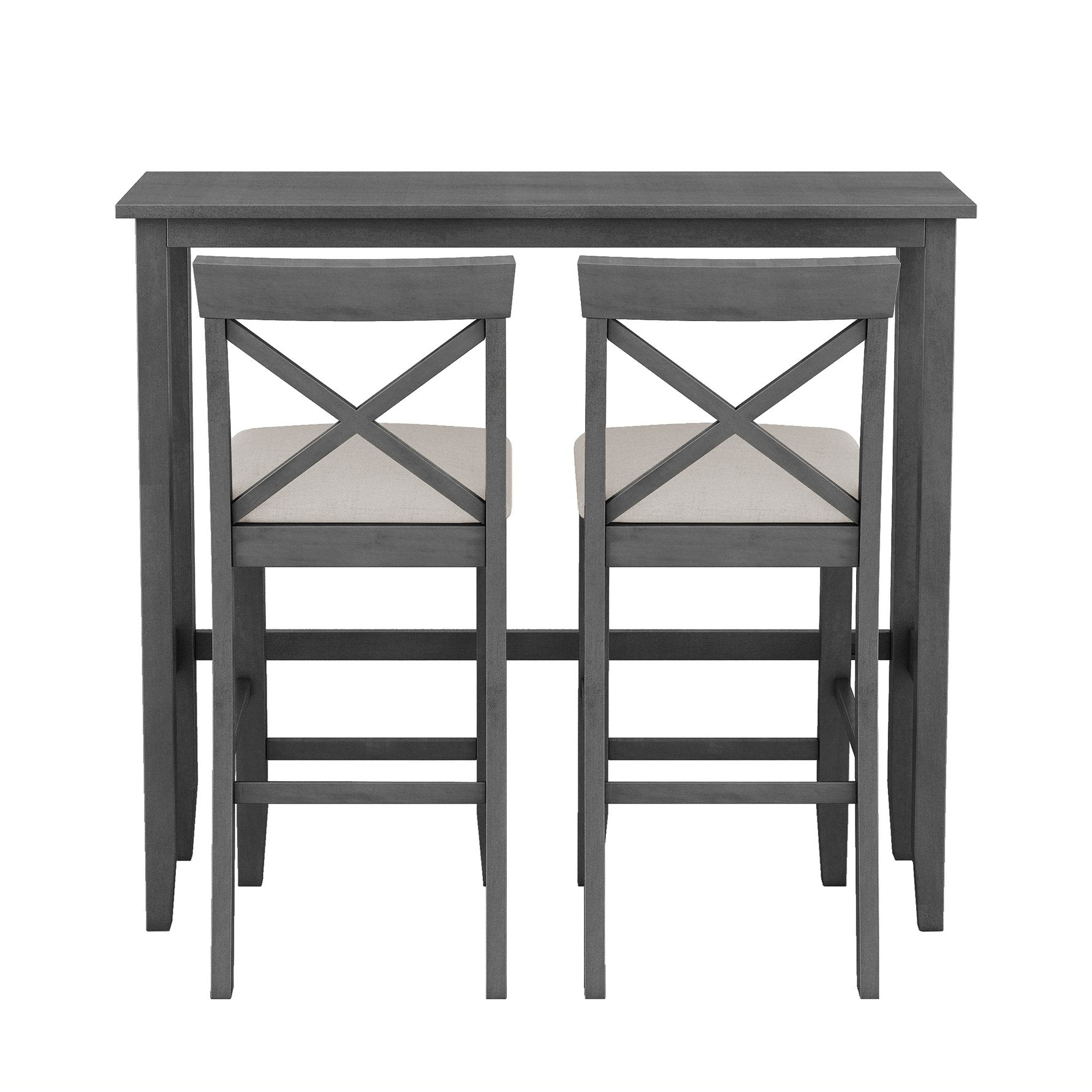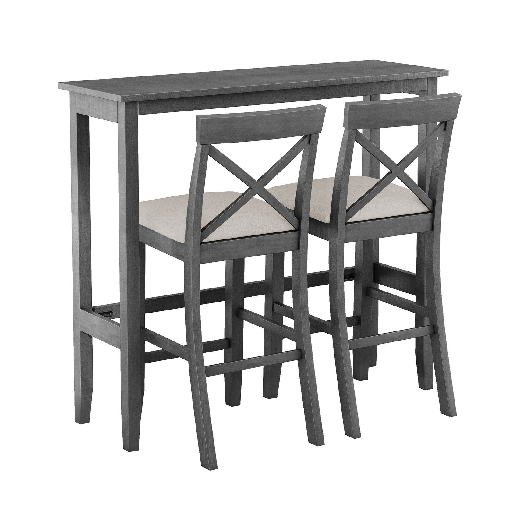 Enjoy relaxed, rustic charm in a compact footprint with this 3-piece farmhouse bar-height breakfast set—perfect for small kitchens, breakfast nooks, or multifunctional living spaces. The clean lines and muted gray frame paired with beige linen cushions create an inviting, contemporary farmhouse look while the tall, space-saving profile lets chairs tuck neatly under the table when not in use.