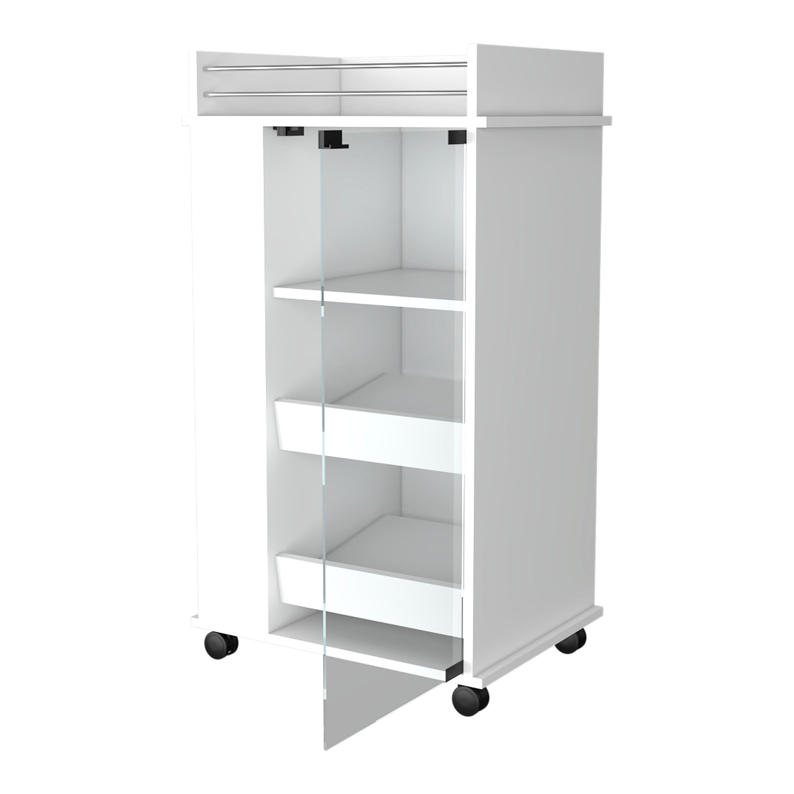 Elevate your home entertaining with this elegant white bar cart that blends modern functionality and refined display. Designed for wine and spirit enthusiasts, it offers secure storage behind a clear glass door, a built-in 2-bottle holder, and smooth casters for effortless mobility — making it an ideal solution for serving, storing, and showcasing your favorite beverages.