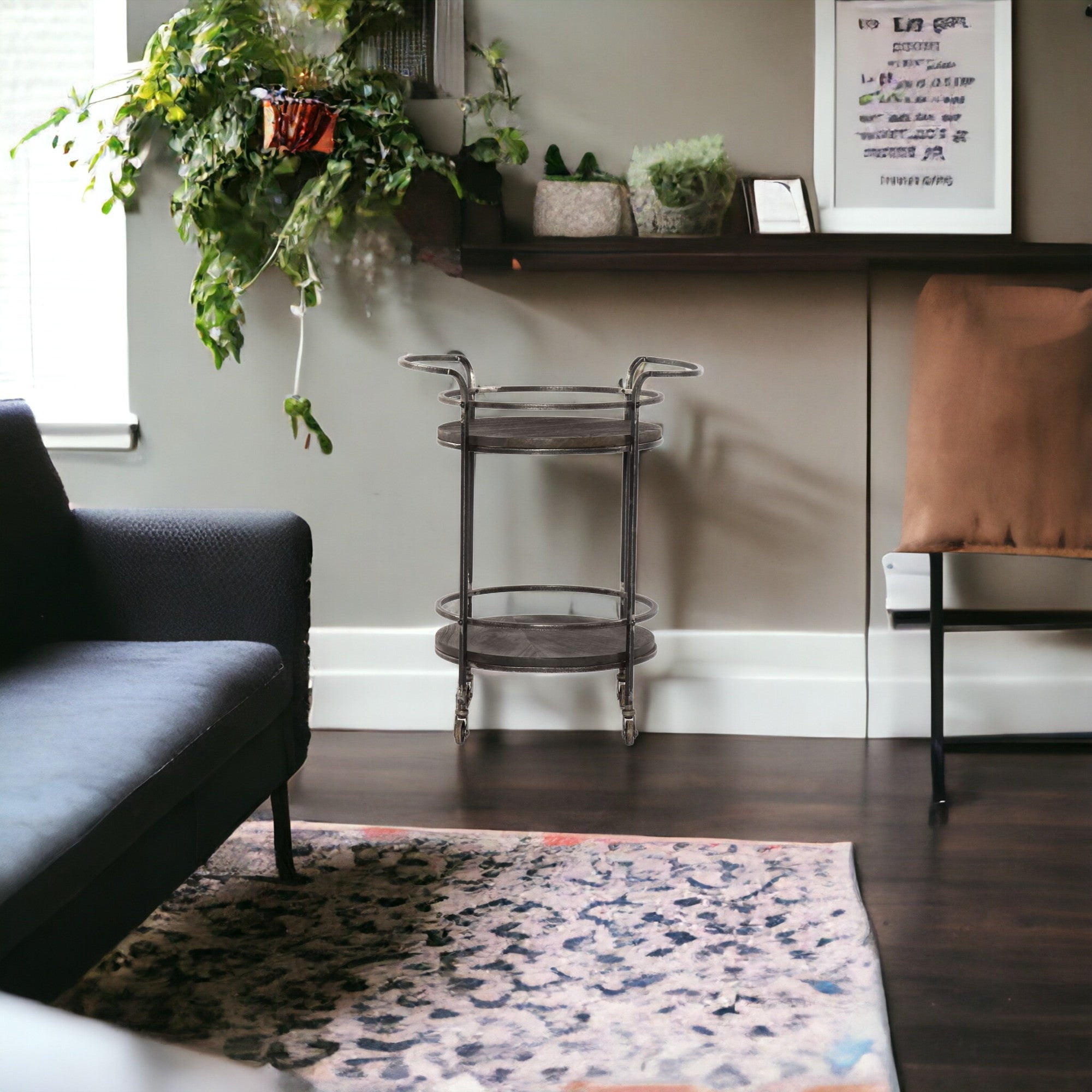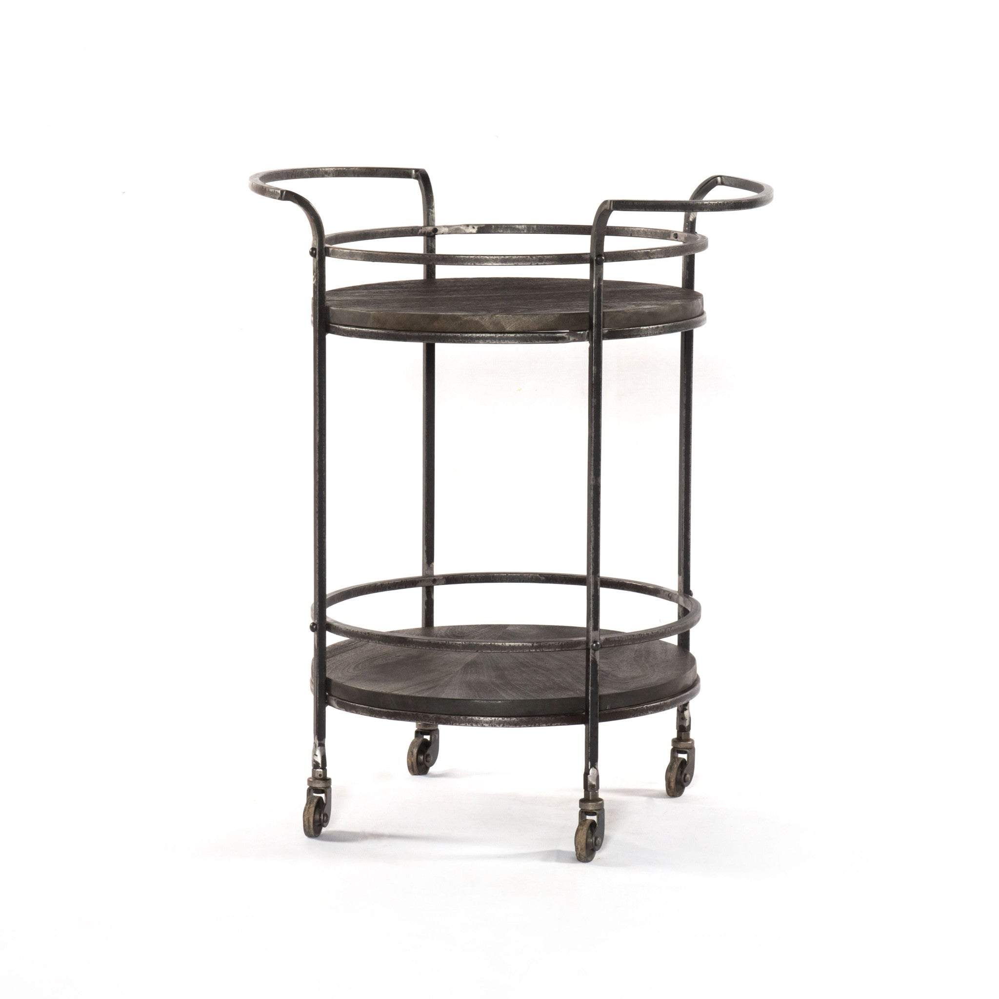- Modern rustic and distressed vintage style bar cart with a dark gray color.