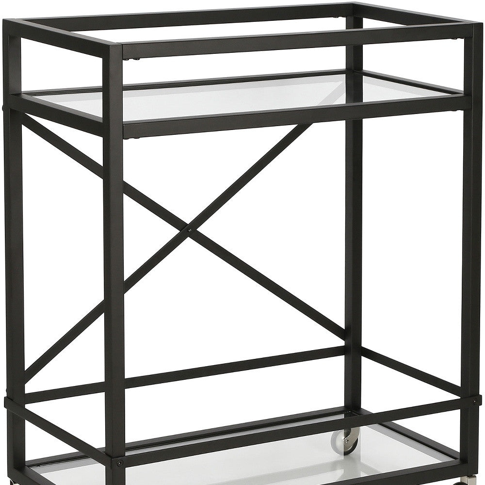 - Modern industrial blackened bronze bar cart with two tiers of shelving and storage space.
