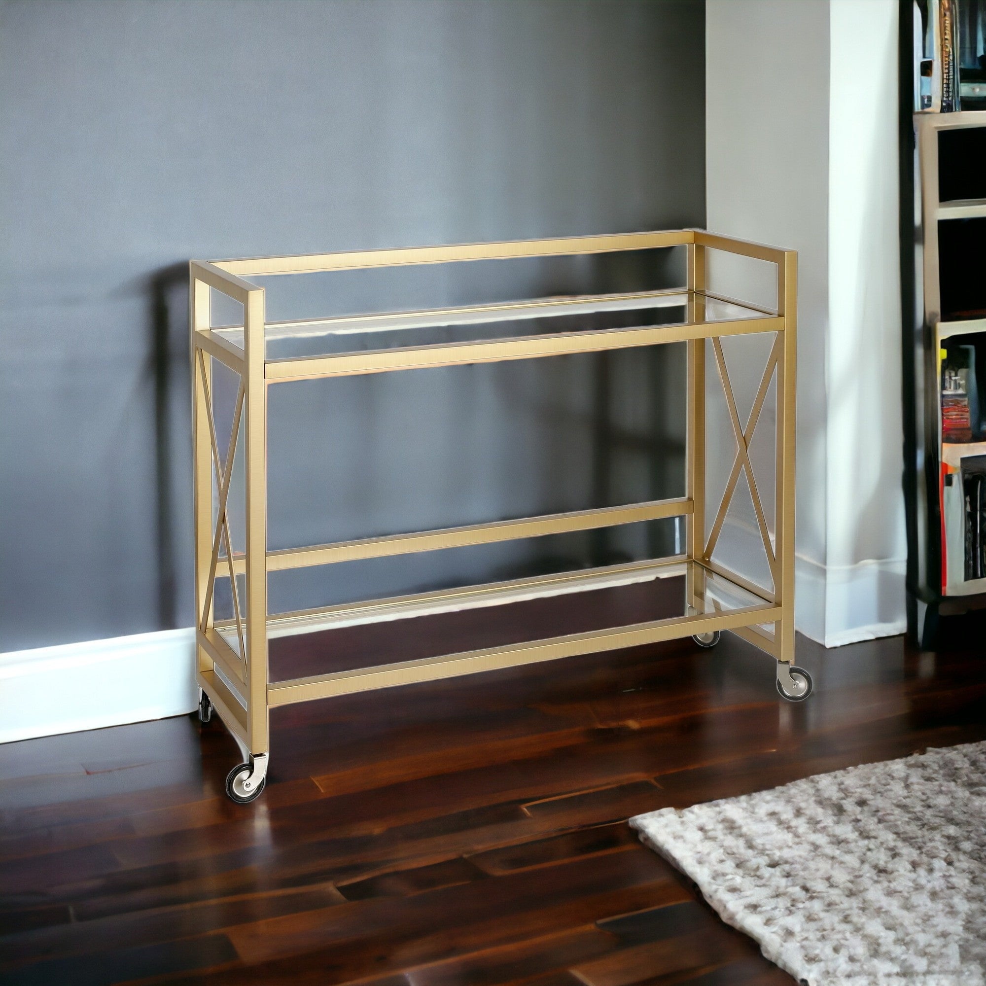 - Modern golden brass bar cart with glass shelving for a luxurious look.